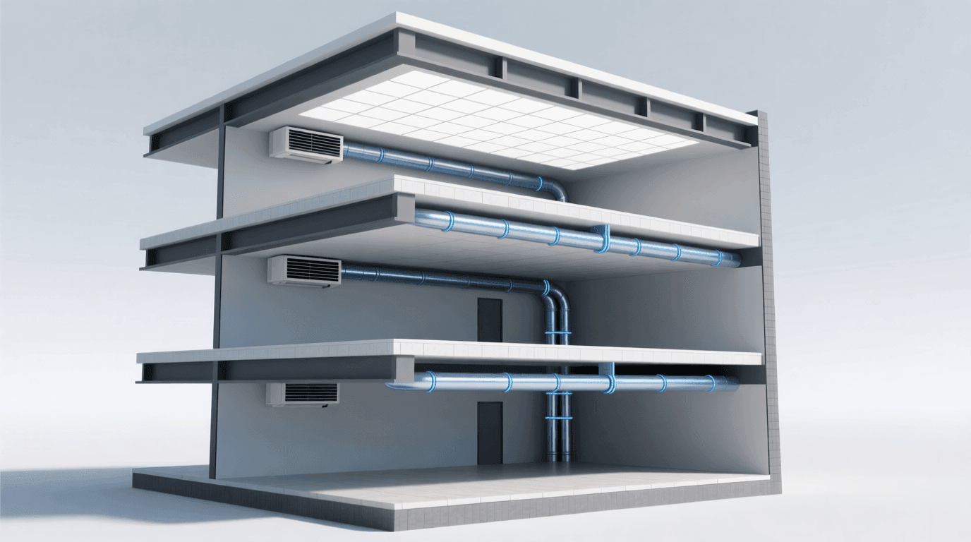 成都某甲级写字楼在设计时把风管的走向与结构梁的方向统一考虑。主风管平行于主梁走,支风管垂直于主梁。这样风管大部分时间都在梁间穿行,最大限度节省了设备层高度,让层高从原本需要的4.8米降到了4.5米。整栋30层的楼省下了9米高度,相当于省了2层楼。