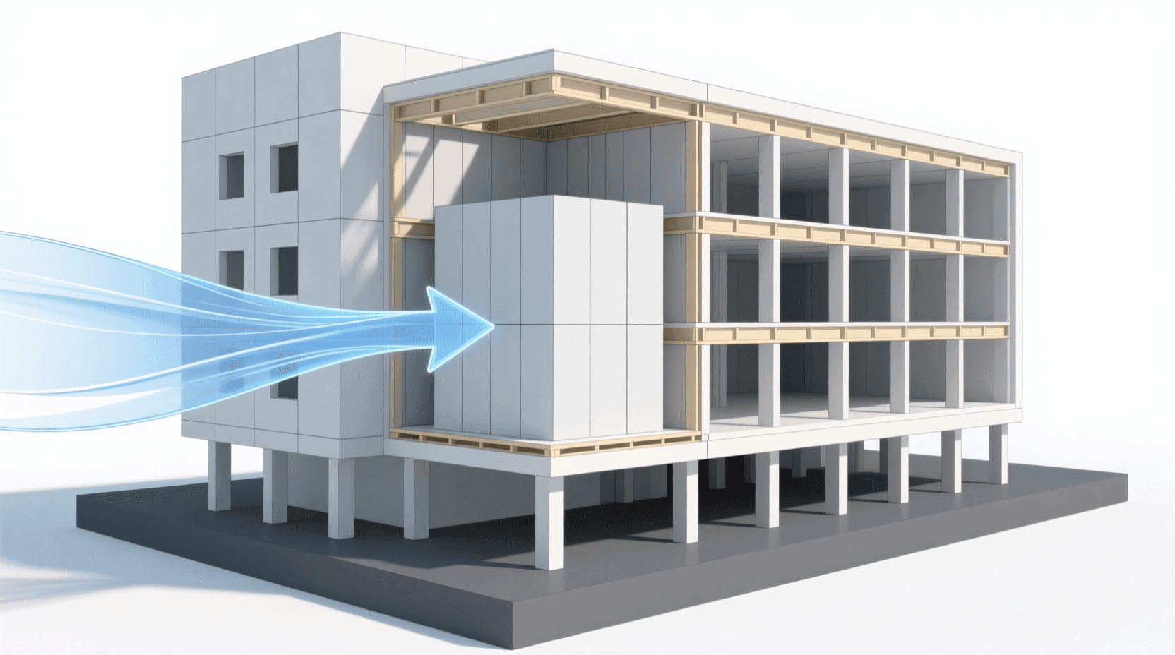 在承重墙板系统中,楼板搭在墙上,墙再把荷载传递到下一层的墙,最终传到地基。这就要求墙的位置必须上下对齐——你不能在三楼的墙下方悬空。