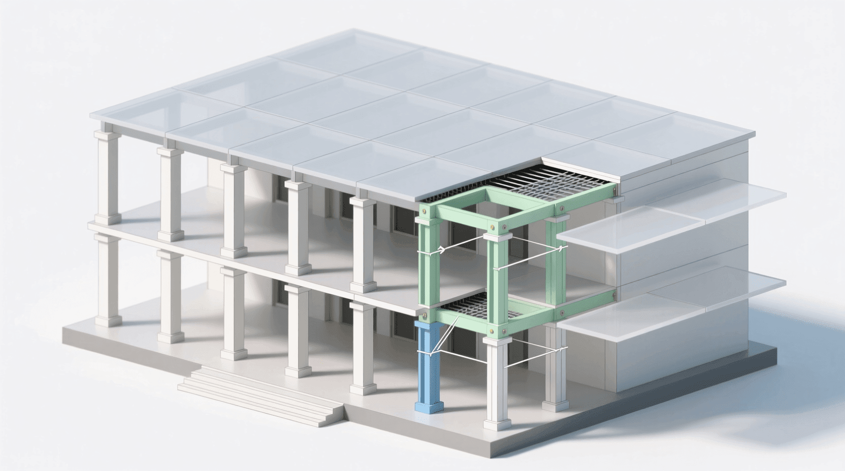 第二种做法是在部分位置设置支撑框架或剪力墙。这些稳定元素可以布置在建筑内部(比如楼梯间、电梯井),也可以布置在外围。只要数量和位置合理,它们就能承担主要的抗侧力,让其他柱梁保持简单的铰接连接即可。