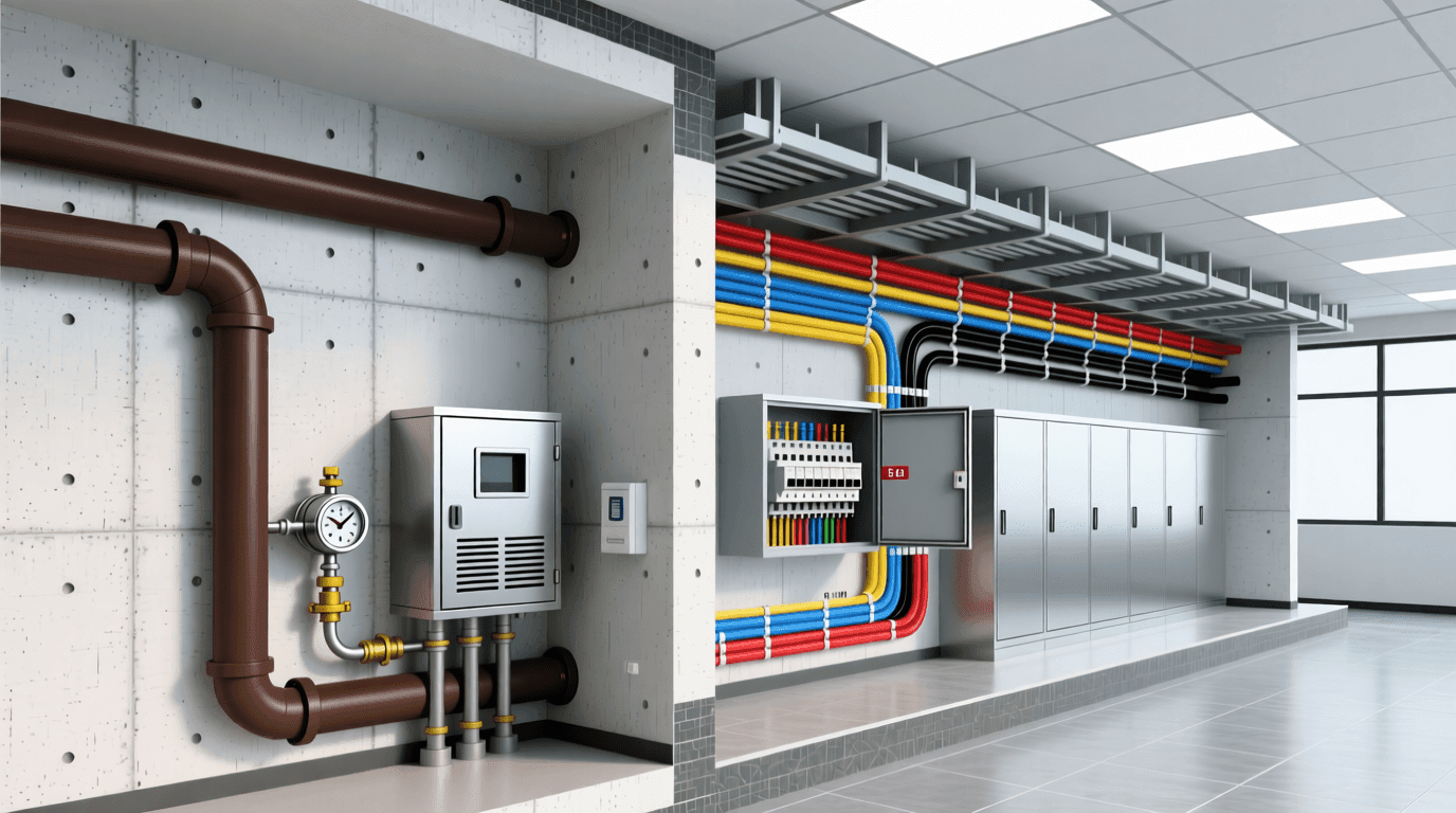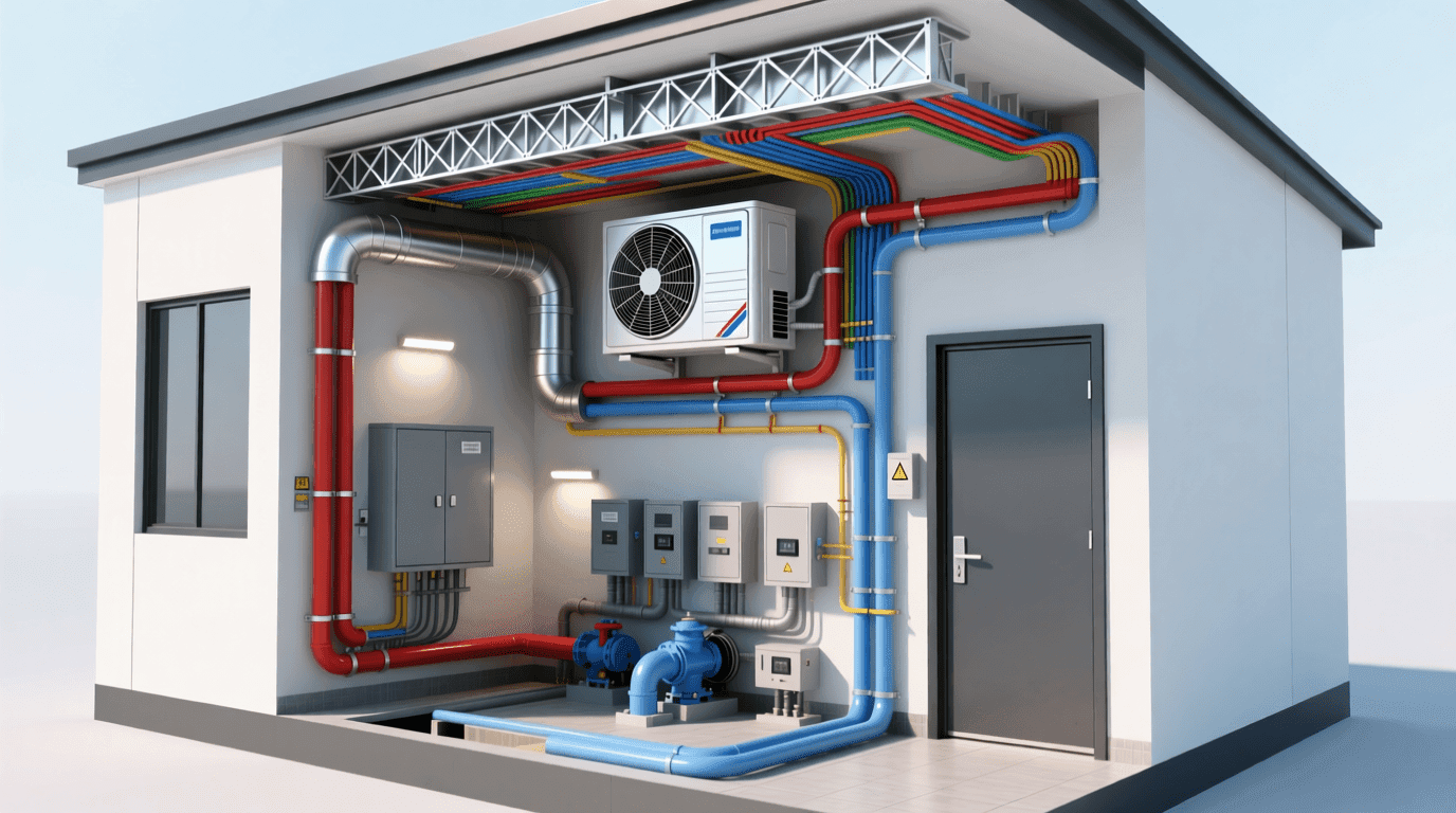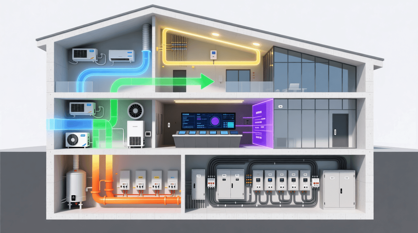 在现代建筑中,机械与电气系统就像建筑的“血液循环系统”和“神经网络”,始终贯穿于建筑的各个角落。机械系统主要包括供暖、通风、空调(HVAC)、给排水、电梯等部分,而电气系统涵盖了供配电、照明、弱电、消防自动化等子系统。这些系统共同作用,保障了室内适宜的温度、清新的空气、充足的水源与电力供应,为居者创造了舒适、健康、高效的环境。