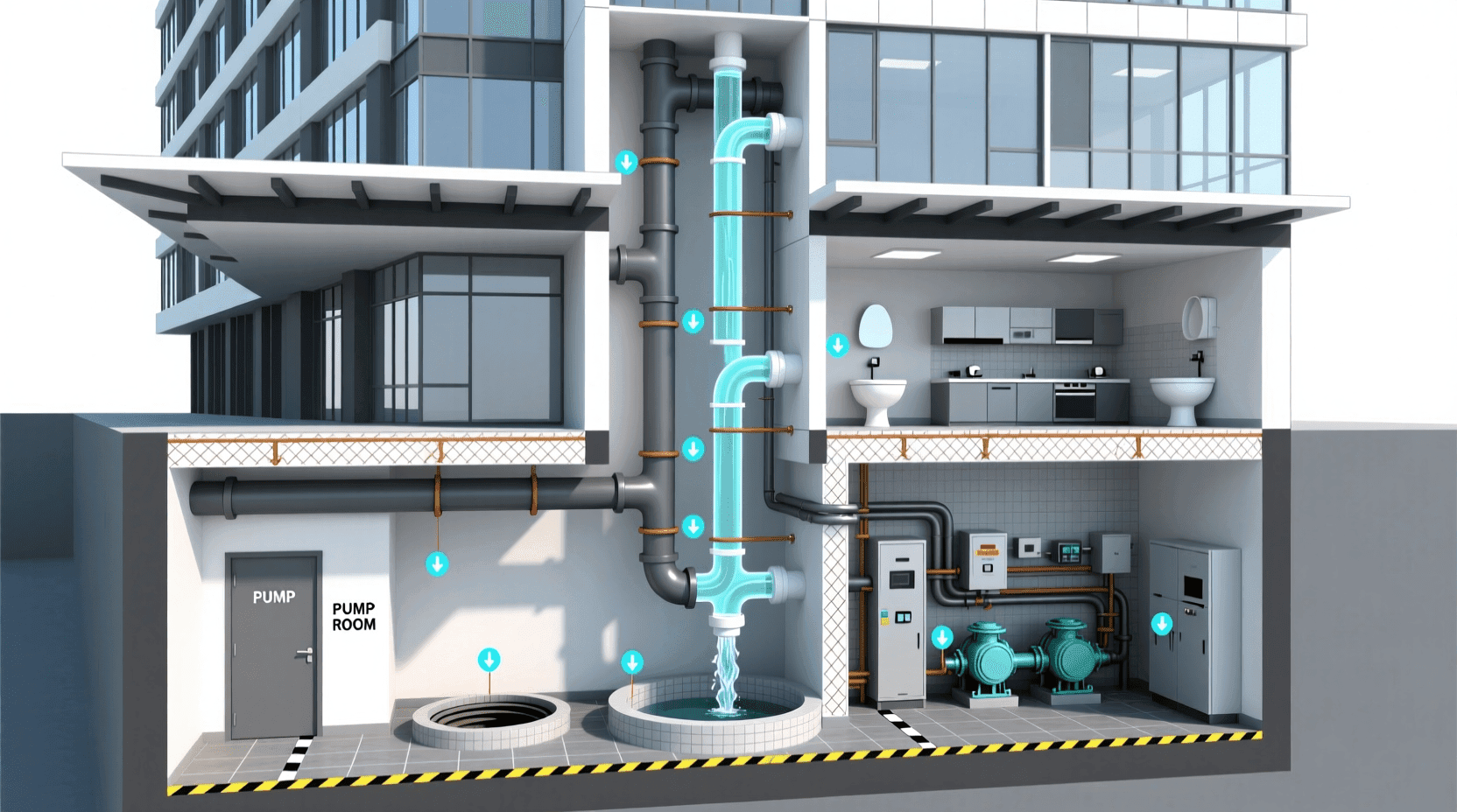 现代排水系统越来越多采用同层排水技术。传统方式中卫生器具的存水弯在楼下,维修需要进入下层住户。同层排水将所有管道和存水弯都设置在本层,大大方便了维修和改造。