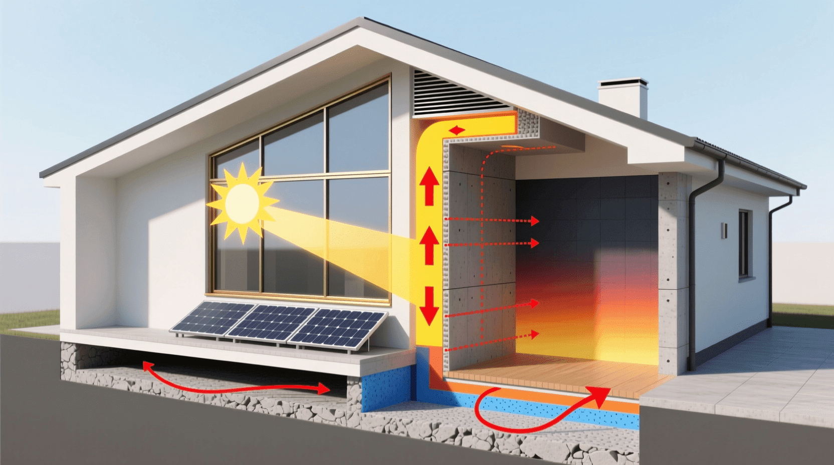 特朗布墙的最大优点是能够有效隔绝眩光和紫外线辐射,同时提供延时的供热效果。墙体从吸收热量到内表面温度升高通常需要4到8小时,这意味着白天吸收的热量会在傍晚和前半夜释放,正好满足了供暖的时间需求。但这种系统也占用了相当大的空间,墙体会阻挡视线,使得南向窗户无法用于采光和眺望,这在一定程度上降低了空间的使用品质。