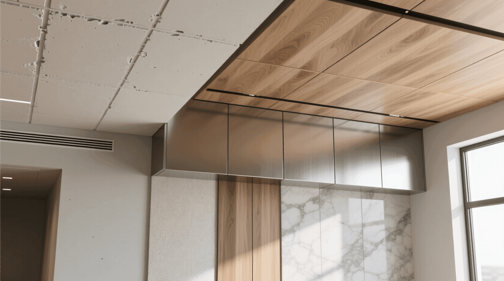 铝扣板是金属吊顶材料的代表,以铝合金板材为基材,表面进行喷涂或覆膜处理。铝扣板防水防潮、耐腐蚀、易清洁、使用寿命长,特别适合厨房和卫生间等潮湿环境。铝扣板的厚度通常在0.5mm至0.8mm之间,过薄容易变形,过厚则增加成本且无必要。