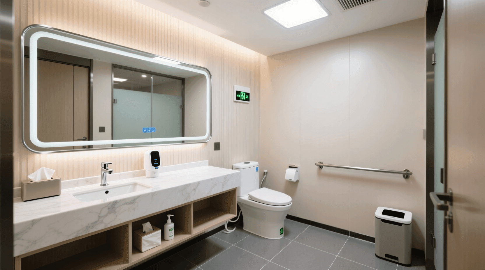 为了提升使用体验,办公楼卫生间采用了以下优化措施:在每个隔间门上设置占用指示灯,使用者可以一眼看出哪个隔间空闲;在洗手台配置感应式水龙头和自动皂液器,减少接触传播疾病的风险;在女卫设置化妆台和全身镜,方便女性员工整理仪容;在公共区域设置空气质量监测系统,实时显示温湿度和PM2.5数值,自动调节新风量。