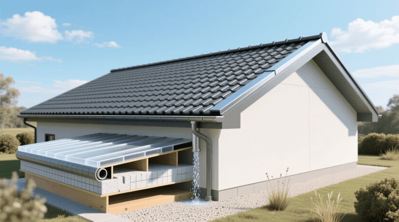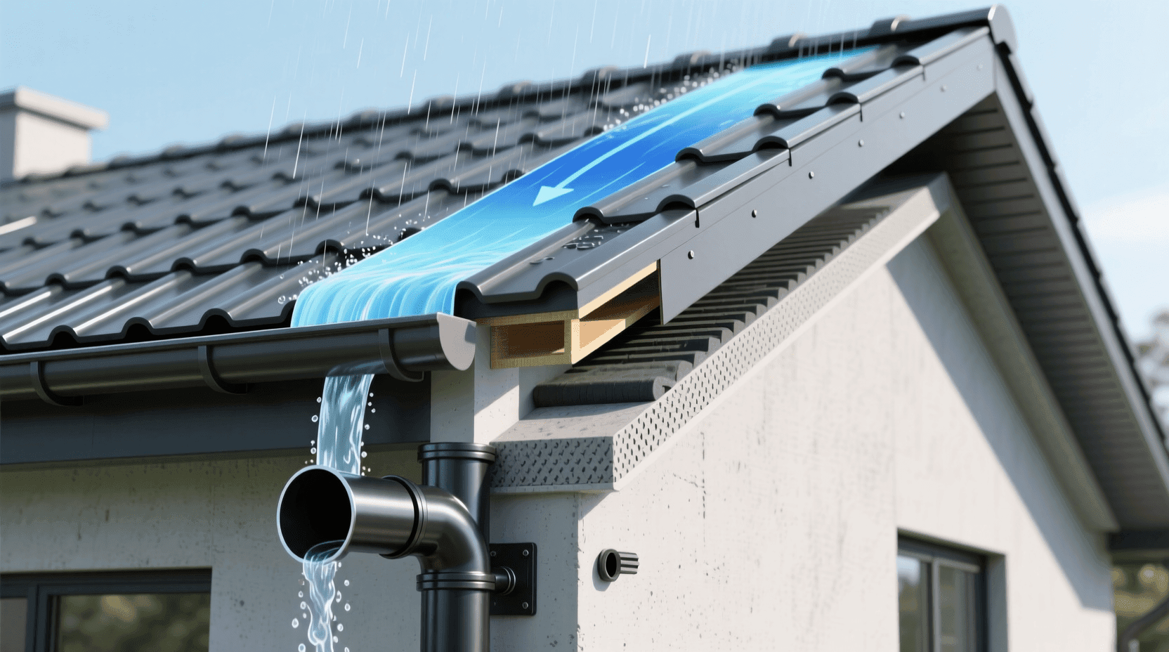 在坡屋顶建筑中,檐沟(gutter)是收集屋面雨水的重要构件。檐沟可以是外挂式,也可以是内嵌式。外挂式檐沟安装在檐口外侧,施工简便,维修方便,但对建筑立面有一定影响。内嵌式檐沟隐藏在屋面结构内部,外观更加整洁,但施工复杂,防水要求更高。
