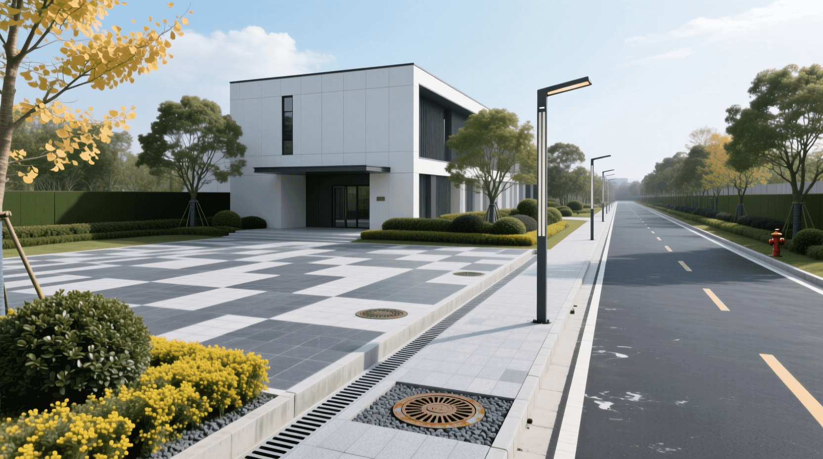 工程设计时应根据实际需求合理搭配不同材料。车行主干道采用混凝土或沥青路面,保证承载能力。人行道和活动广场采用透水材料,减少地表径流。景观节点和建筑入口区域采用石材铺装,提升环境品质。