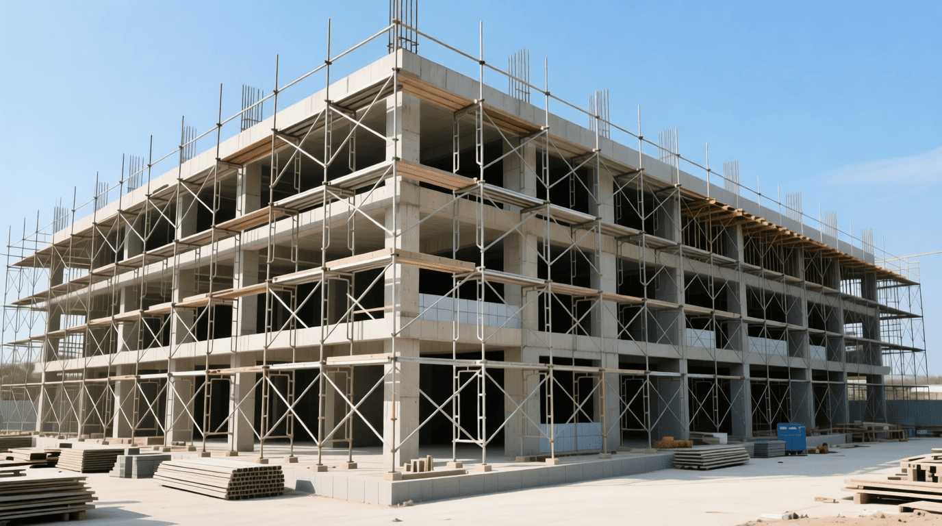 脚手架按搭设位置分为外脚手架和内脚手架。外脚手架搭设在建筑物外侧,用于外墙砌筑和装修施工;内脚手架搭设在建筑物内部,用于内墙砌筑和顶棚施工。多层建筑外墙施工常采用双排脚手架,双排立杆之间铺设脚手板形成操作平台,外侧设置防护栏杆和安全网。