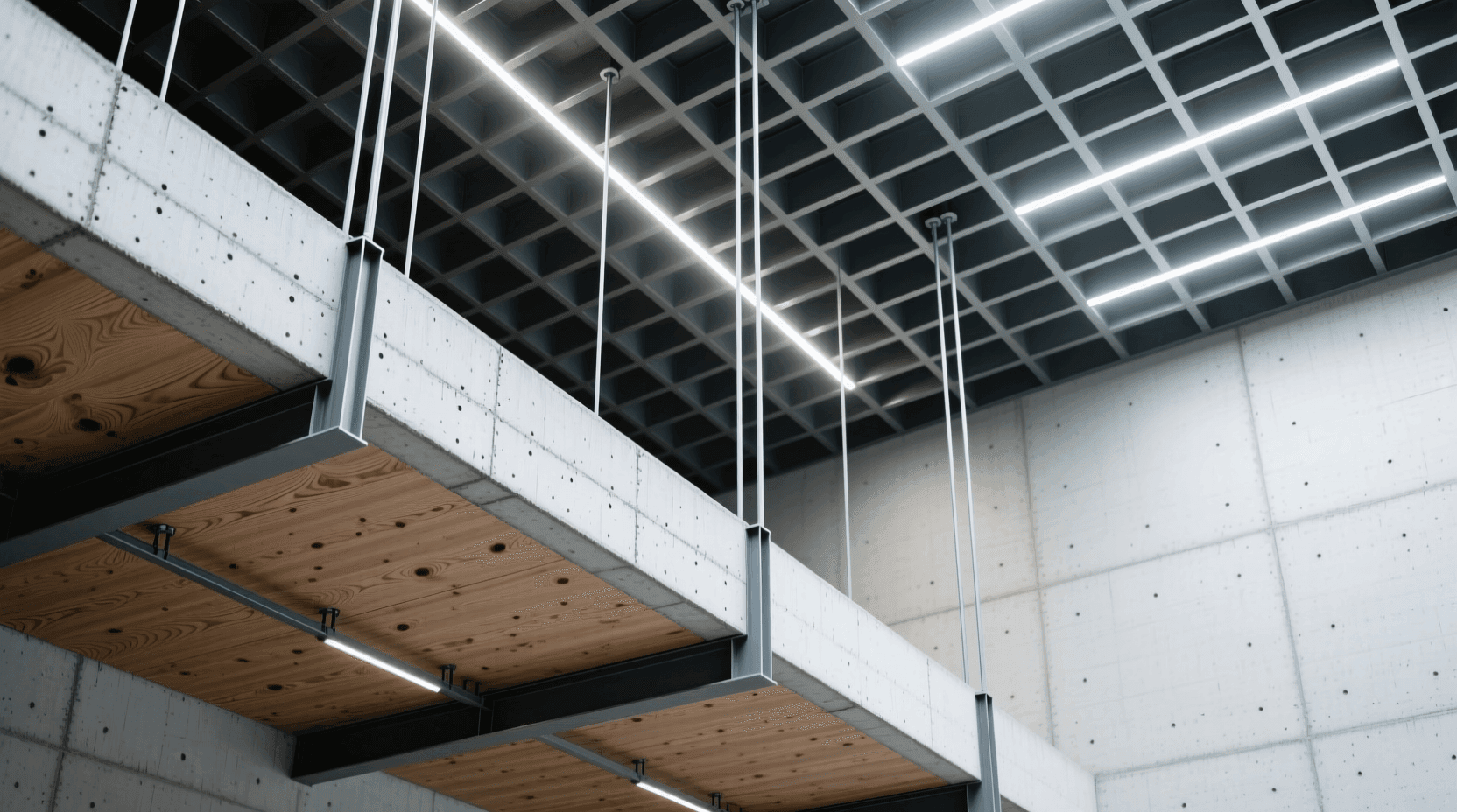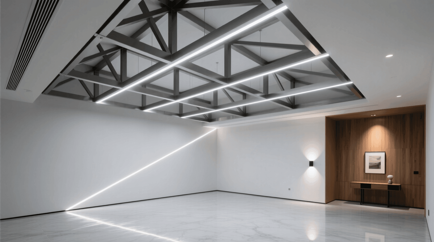 人工照明与结构的结合设计具有更大的可控性。在许多当代建筑中,照明灯具被巧妙地整合进结构系统。比如在梁的底面开槽,嵌入LED灯带,让梁本身发光,既解决了照明需求,又强化了结构的存在感。这种发光的梁在夜晚会成为空间中最引人注目的元素,清晰地勾勒出空间的结构框架。