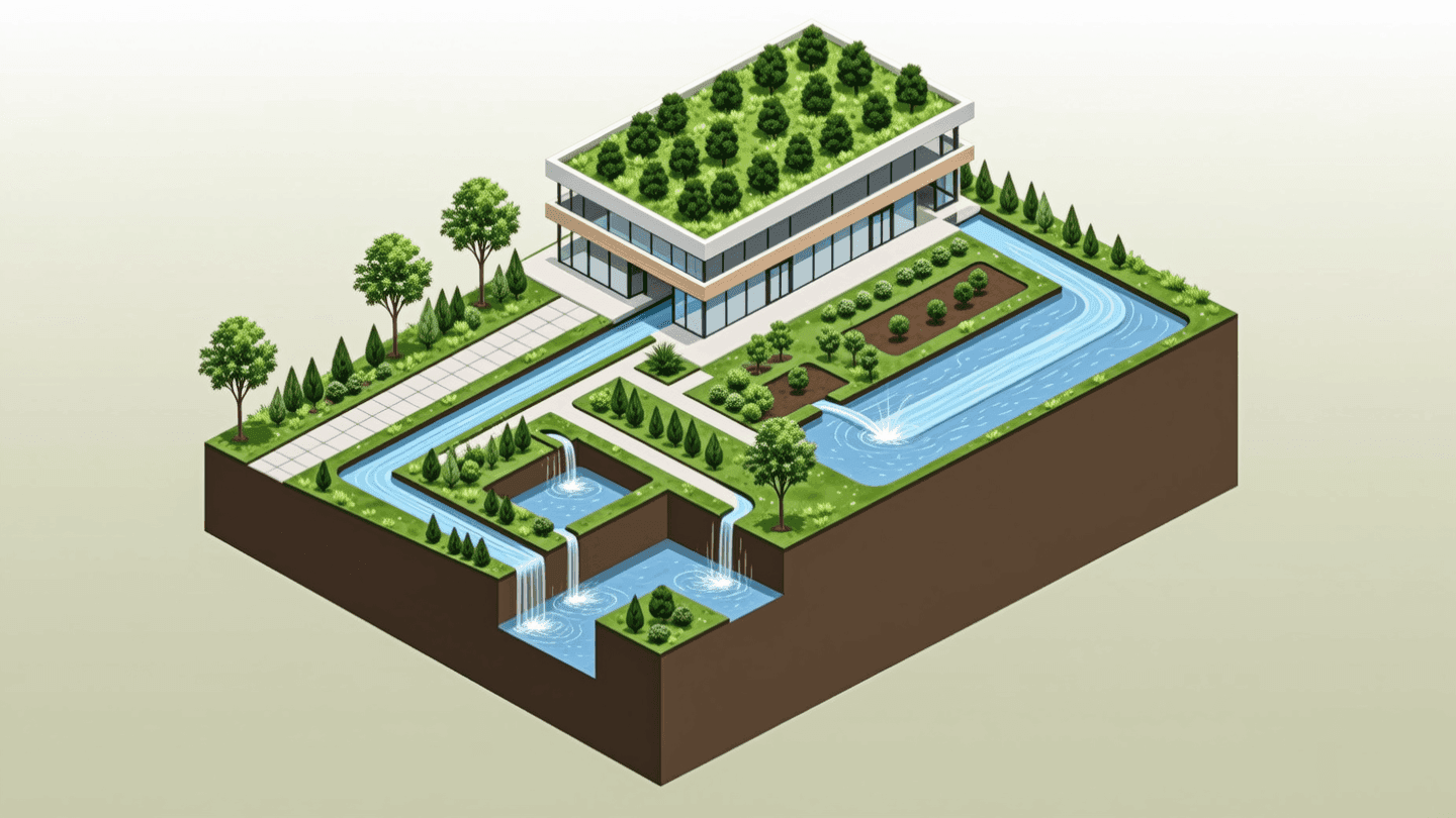 可持续建筑倡导“海绵城市”理念,让建筑和场地像一块海绵一样,吸收、储存、净化并回用雨水。具体策略包括: