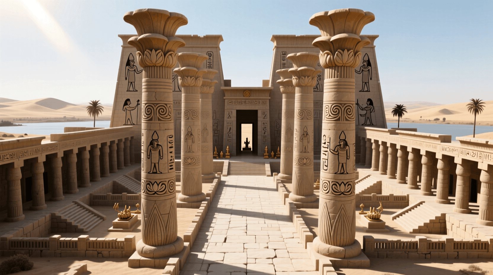 托勒密时期的神庙在规模上不如新王国时期那样宏大,但在精致程度上有了显著提升。菲莱神庙是这一时期的代表作,建在尼罗河第一瀑布附近的菲莱岛上,供奉女神伊西斯。神庙的布局仍然遵循传统的埃及样式——塔门、庭院、柱廊、圣所依次展开,但各部分的比例更加和谐,装饰更加繁复。柱廊采用了希腊式的列柱结构,柱身更加修长,柱头的雕刻也更加精美。