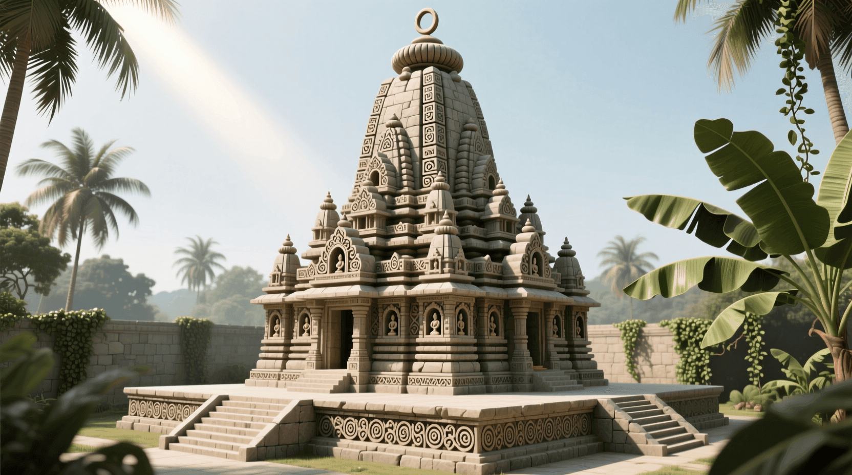 北方印度教建筑与南方达罗毗荼风格的差异,在形态上一目了然。南方寺庙的塔身表面是平坦的,装饰以水平带状分层;北方寺庙的塔身表面是凸曲的,装饰以垂直肋条划分。这种差异源于不同的结构逻辑和美学取向。