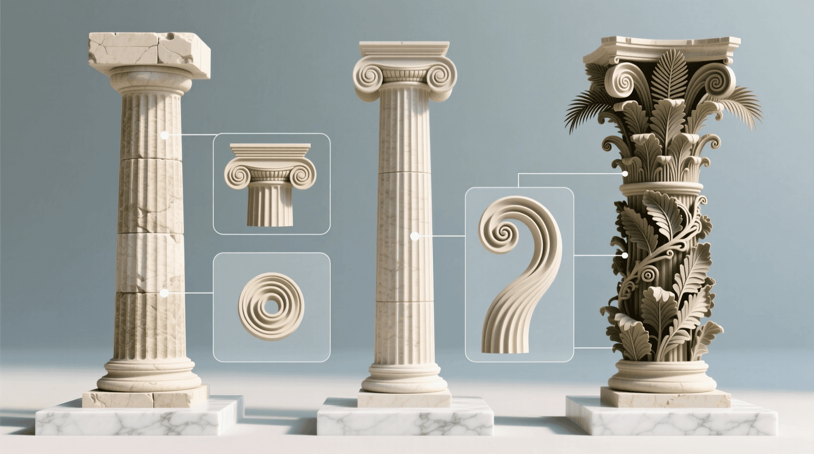 柱头的造型是爱奥尼柱式最具辨识度的特征。不同于多立克的简单圆盘,爱奥尼柱头两侧各有一个向外卷曲的涡卷,形似贝壳或者乐谱的卷轴。这种装饰元素源自植物卷须的形态,但被高度程式化,成为一种纯粹的几何图案。