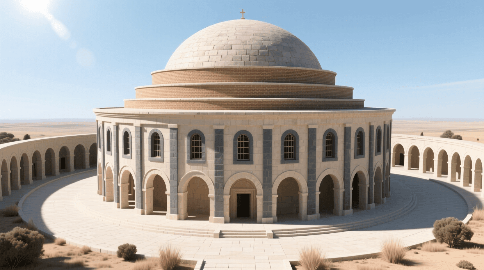 集中式建筑的核心特征是所有的空间元素都围绕一个中心点组织。建筑通常采用圆形、八角形或其他多边形平面,空间向上发展形成穹顶。一圈柱子围绕着中央空间,柱子支撑着环形的拱券或穹顶,柱子之上的墙体开设一圈窗户,形成采光的天窗系统。这种设计使得光线从上方倾泻而下,照亮中央的洗礼池或石棺。