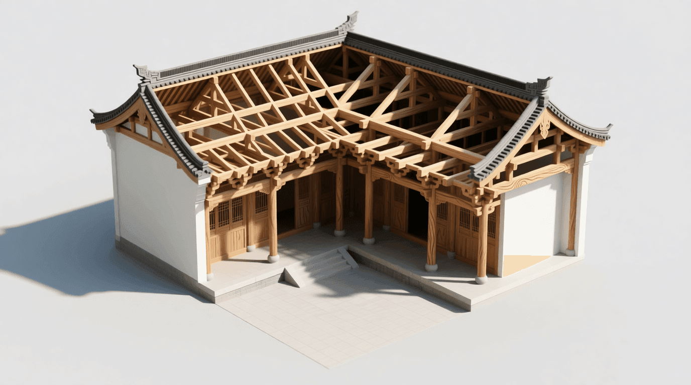 中国传统建筑的核心是木构架体系。这个体系的基本原理是:用木柱或石柱支撑横梁,横梁之间用穿枋连接,形成稳定的框架结构,然后在框架外侧填充墙体。这种“框架承重,墙体围护”的做法,使得墙体不承受建筑的重量,仅起到分隔和遮蔽的作用。