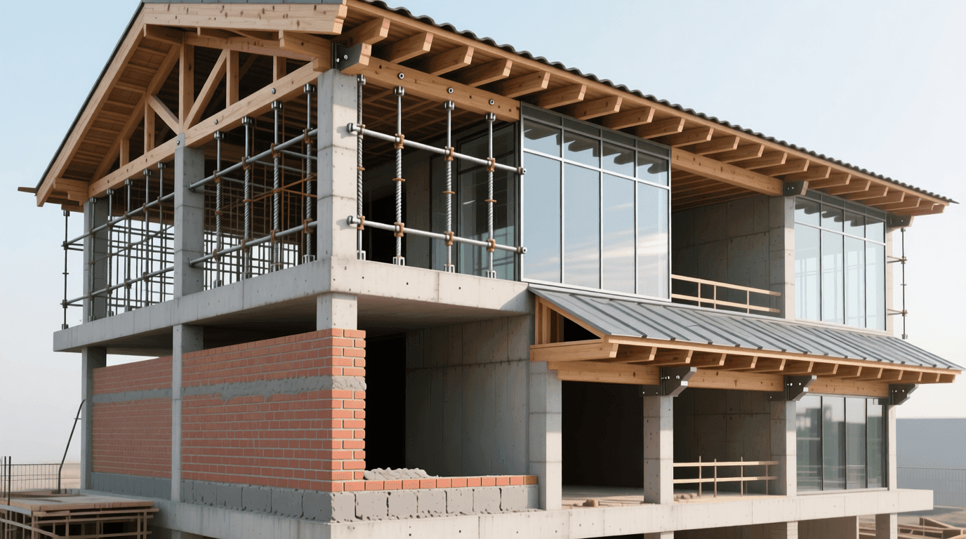 最常见的混合结构是砖混结构,即砖砌体承重墙加钢筋混凝土楼板和梁。这种结构在多层住宅中应用极广。墙体用砖砌筑,楼板用现浇或预制的钢筋混凝土板,楼梯、阳台等局部用混凝土梁和板。这种组合既发挥了砖的经济性和保温性,又利用了钢筋混凝土的跨越能力和整体性。