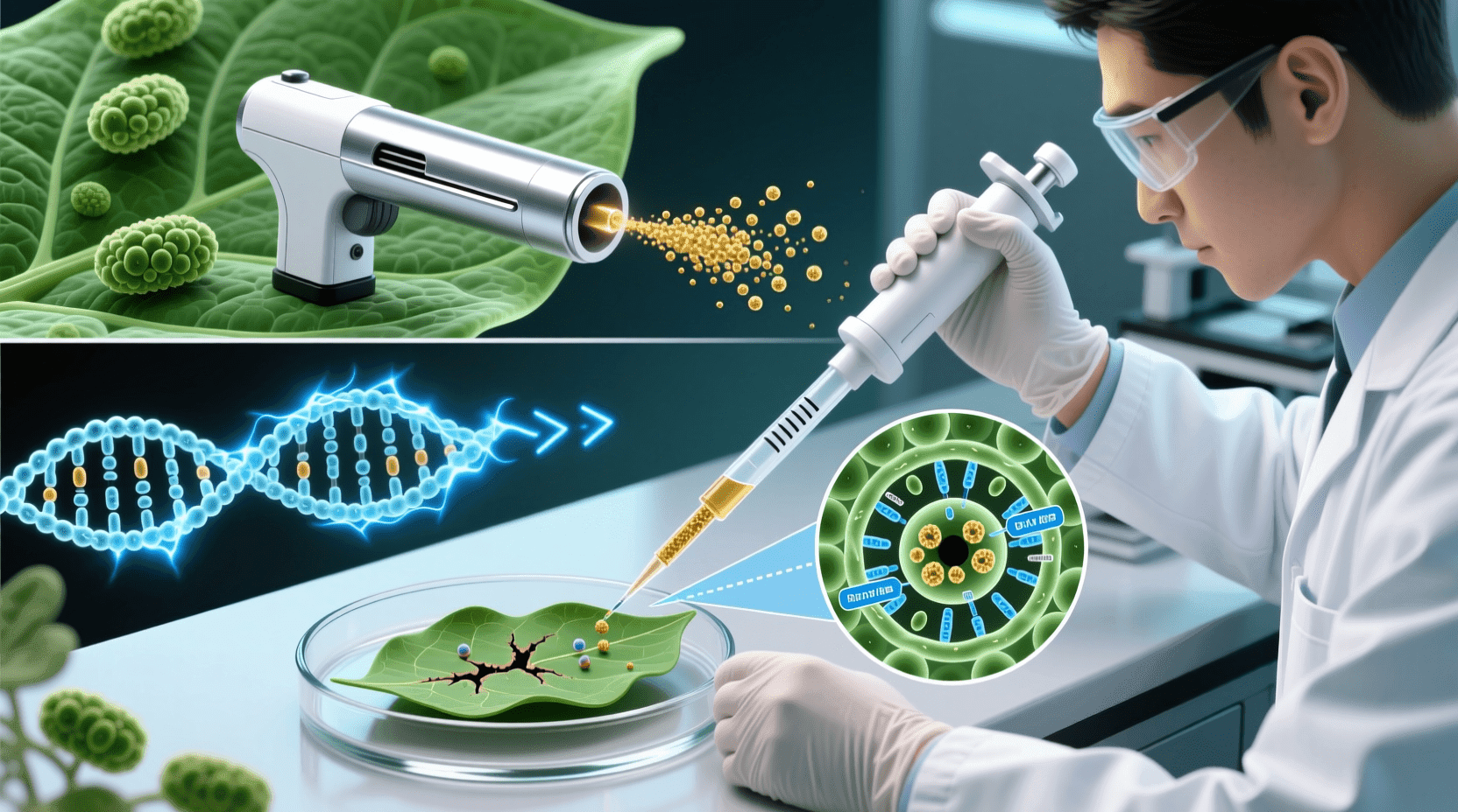 基因枪法,俗称“基因大炮法”,利用高压氦气或火药瞬间加速携带DNA的金属微粒(如金/钨粒),将其直接射入植物细胞甚至细胞核内。该法能够突破植物细胞壁的物理屏障,适用于农杆菌法不易转化的作物,尤其是大多数单子叶如玉米、水稻等。