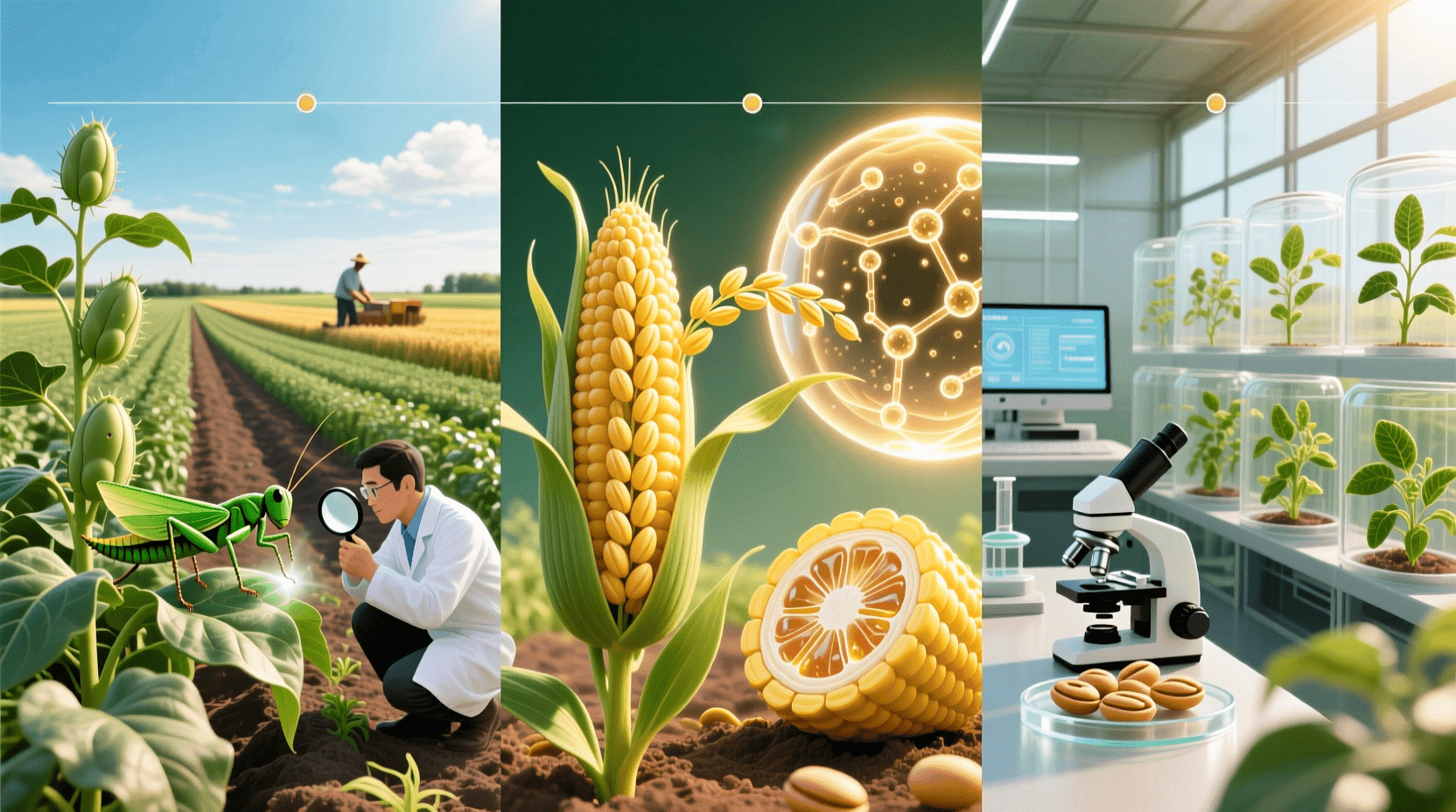 害虫每年造成全球高达20%-40%的作物产量损失,是制约农业生产的重要因素。传统防治依赖化学农药,带来环境污染和害虫抗药性等问题。以Bt基因为代表的抗虫性状改良,为农作物“穿上了生物防护服”:通过将巴氏苏云金芽孢杆菌中的杀虫晶体蛋白基因导入玉米、棉花等作物,使之能在体内合成 Bt 蛋白,专门杀灭鳞翅目等主要害虫,对人畜无害。