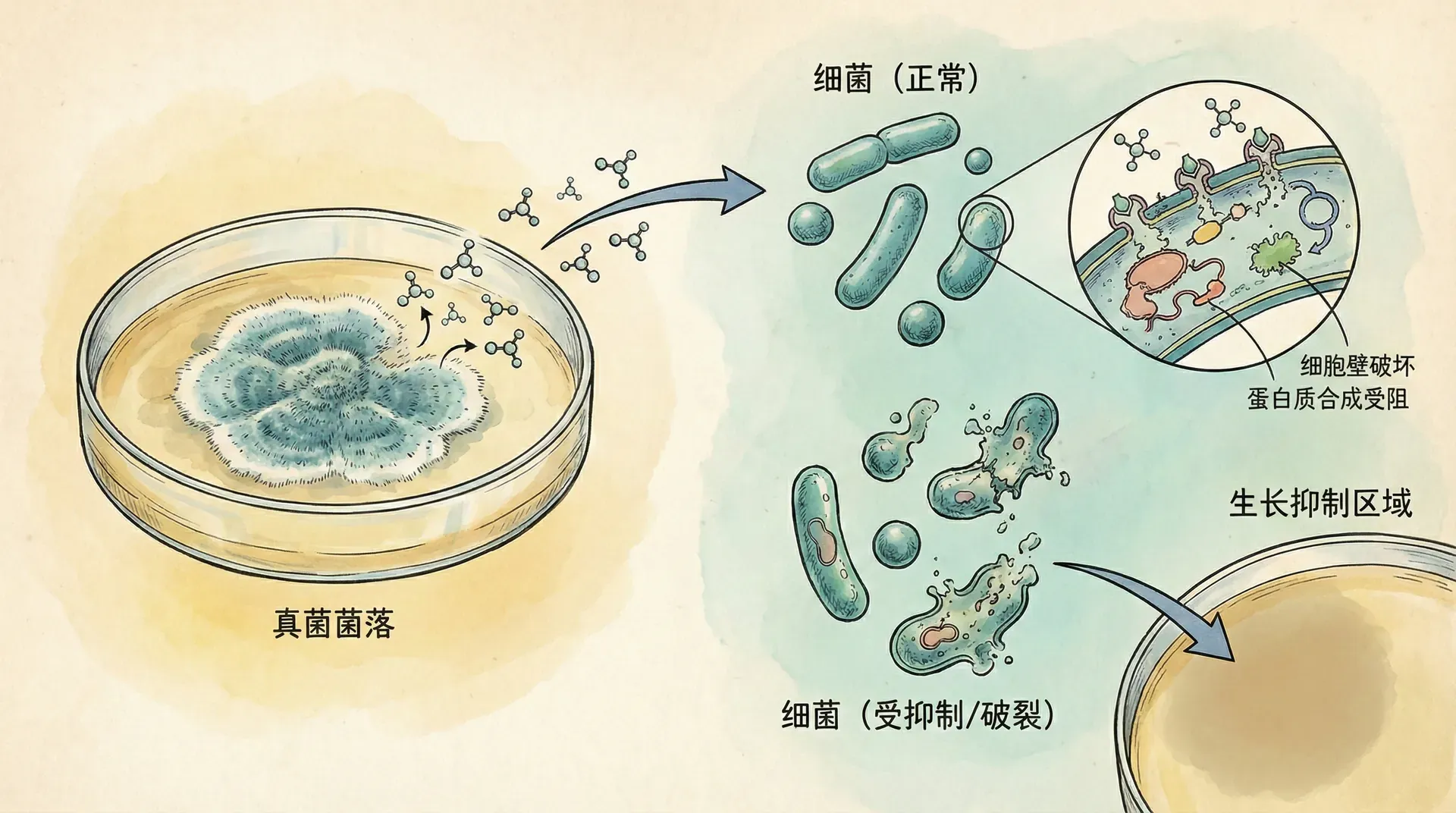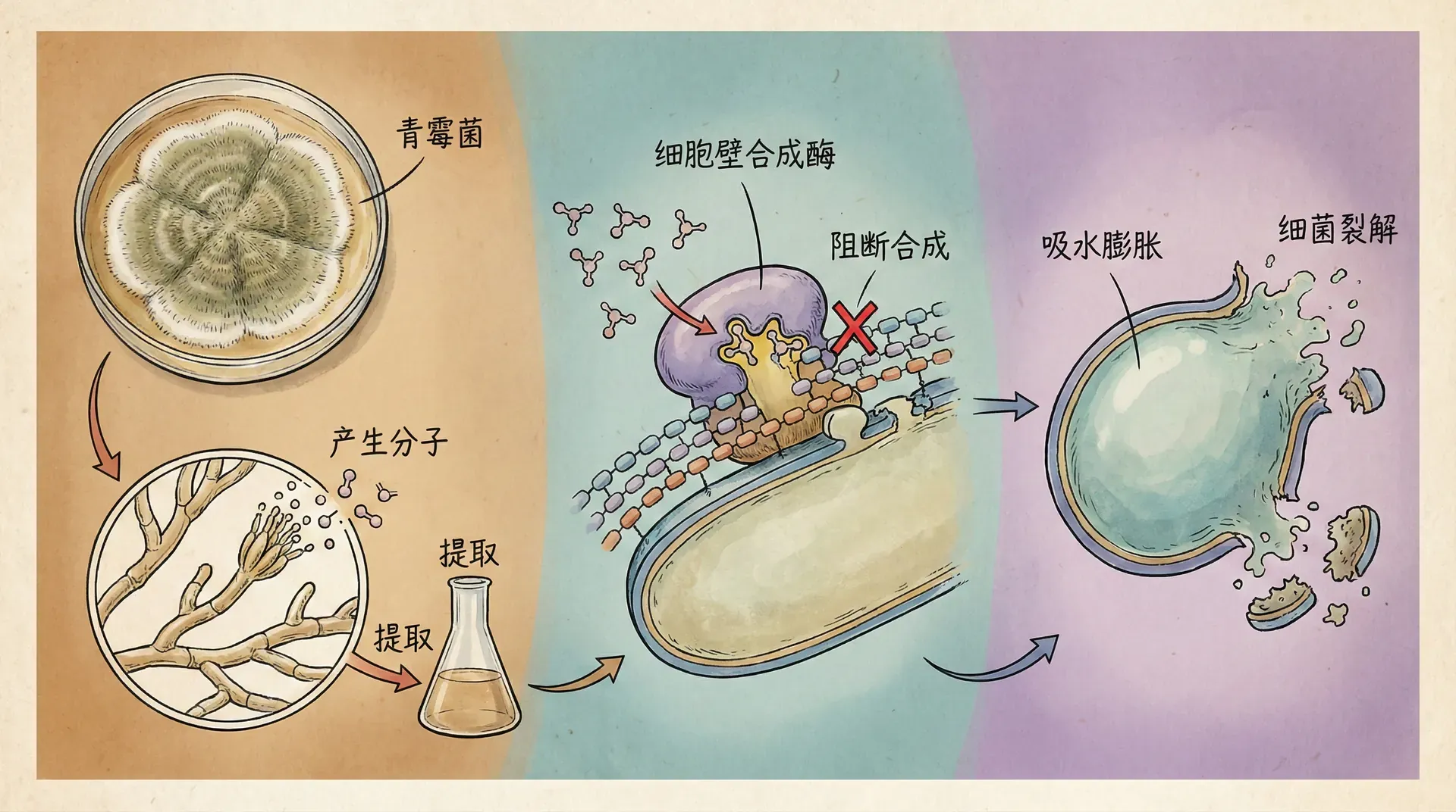青霉素通过抑制细菌细胞壁中肽聚糖的交联酶(转肽酶)活性,阻断细胞壁合成过程。细菌失去细胞壁如同“房屋拆掉了承重墙”,一旦遇到渗透压变化即会破裂死亡。青霉素对许多革兰阳性菌极为有效,曾极大降低了诸如肺炎、败血症等感染的死亡率。