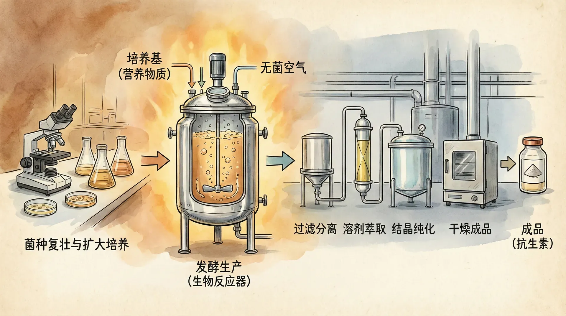 现代抗生素工业主要采用微生物发酵法生产,这是一种利用微生物(如青霉菌、链霉菌等)在控制条件下大量合成抗生素的过程。以青霉素为例,典型生产流程包括: