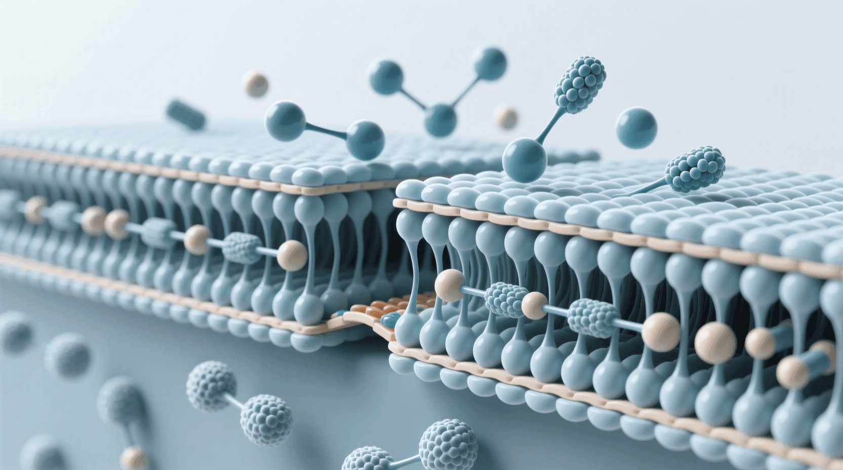 生物膜就像一道智能门禁系统,它的主要成分是脂类分子(尤其是磷脂),每个分子一头亲水、一头疏水。这些分子能自发组装成双分子层结构:两个脂类分子的疏水尾部朝内,亲水头部朝外,构建出一个既阻水又隔离异物的天然屏障。
