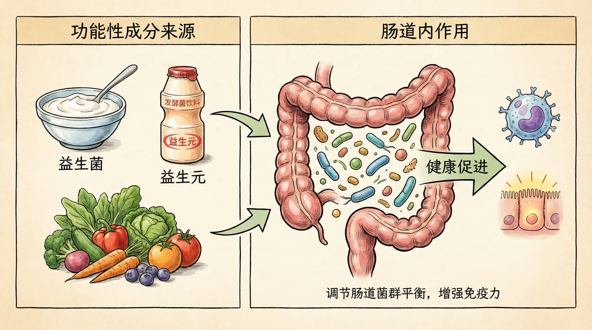 益生菌可牢固附着于肠道黏膜,通过消耗肠道局部营养、调节局部pH值、分泌有机酸(如乳酸、醋酸)、过氧化氢及细菌素等代谢产物,创造对致病细菌不利的微环境,有效阻止有害微生物的生长和侵袭。