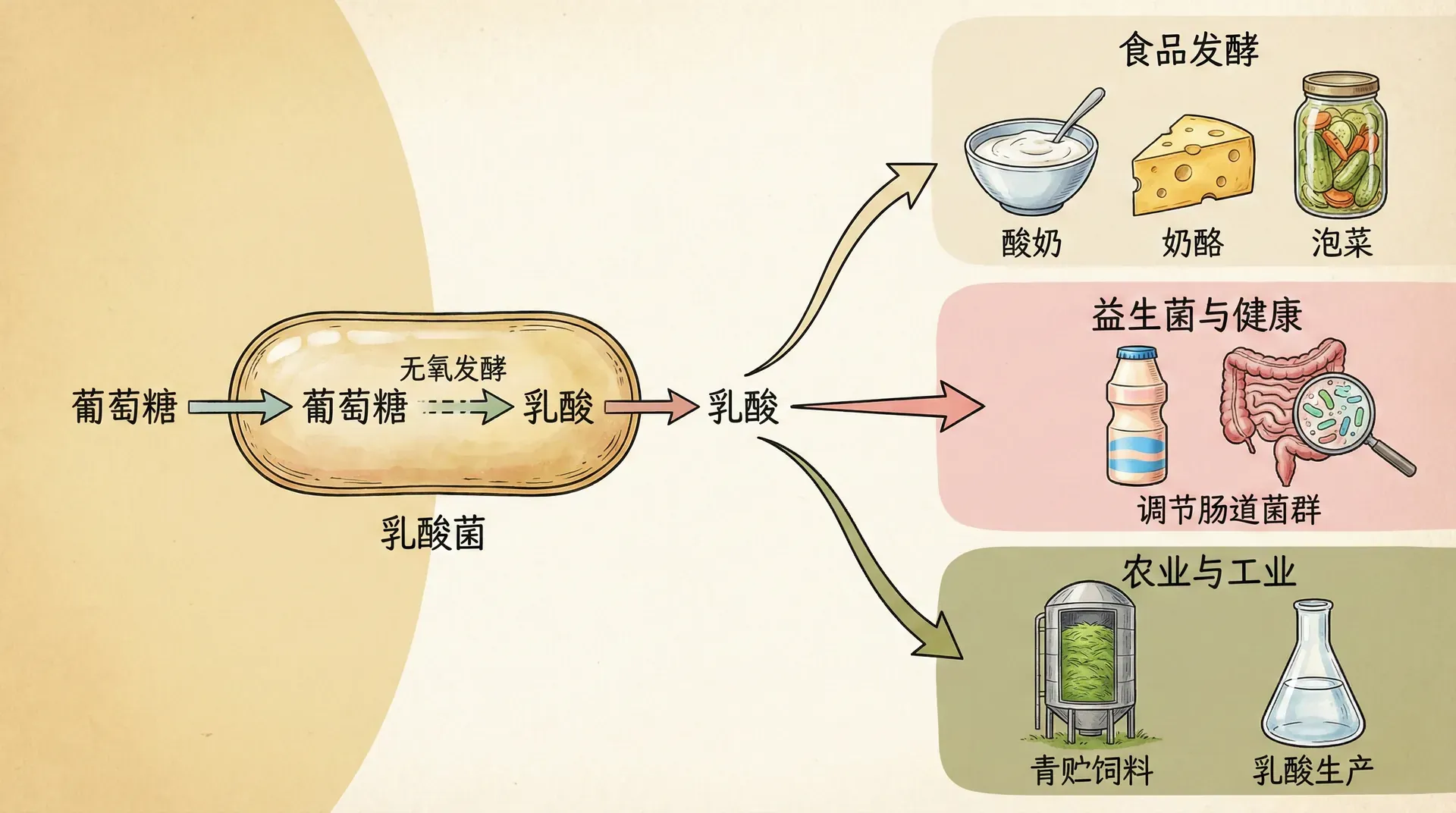 乳酸发酵是一种重要的微生物发酵方式,在食品工业和家庭食品保存中具有极其广泛的应用。常见的应用包括腌制蔬菜(如酸菜、泡菜)、乳制品加工(如酸奶、奶酪)、以及部分肉制品和豆制品的发酵等。其基本原理是指,由乳酸菌(如乳杆菌、链球菌、肠球菌等)通过代谢糖类(葡萄糖、乳糖等),产生乳酸。这一过程中,乳酸的大量生成会明显降低所处环境的pH值,从而形成酸性环境。
