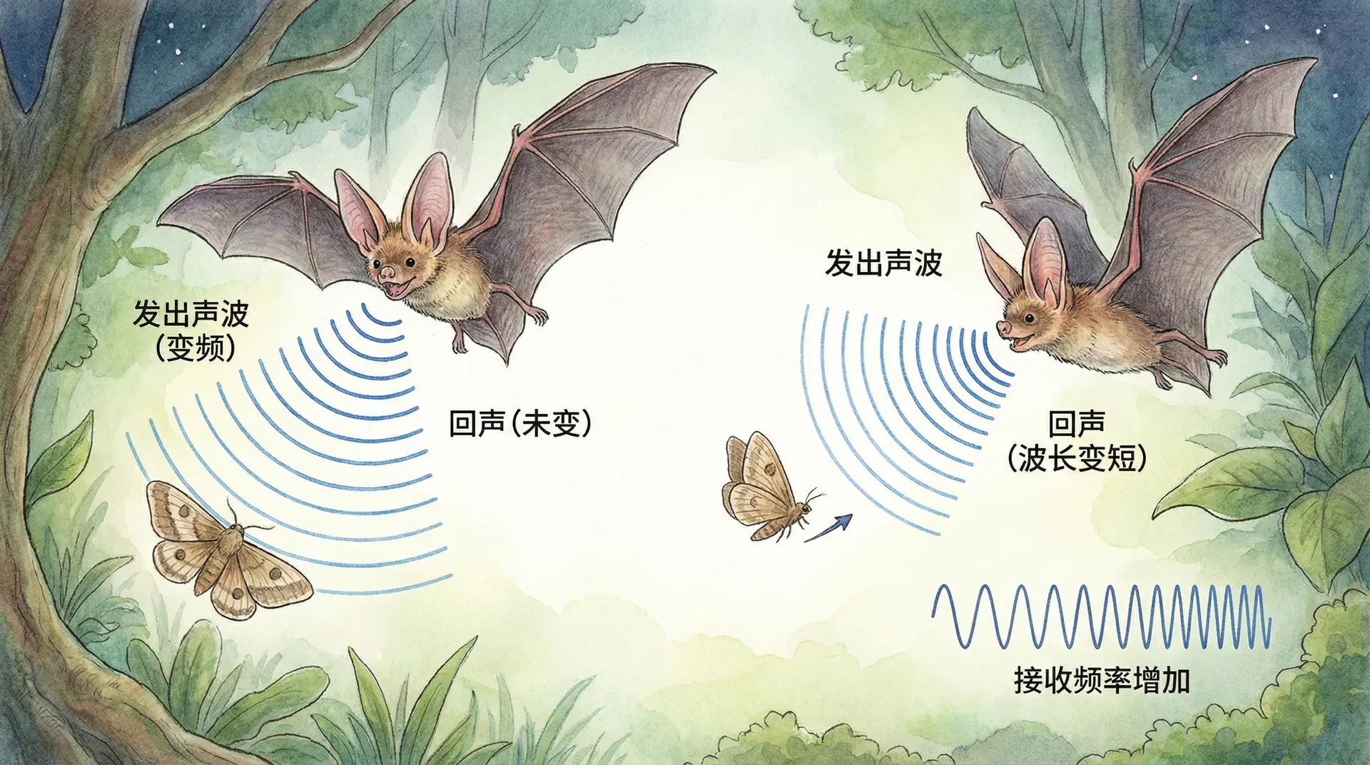 在蝙蝠回声定位艺术中,“多普勒效应”也发挥着无与伦比的作用。我们在生活里都体验过多普勒效应,比如救护车靠近时警笛声变高,远离时又变低。对于蝙蝠来说,当它向着快速移动的小昆虫扑去时,由于自身和猎物之间的距离迅速变化,猎物表面反射回来的回声频率也会发生位移——这就是“多普勒频移”。