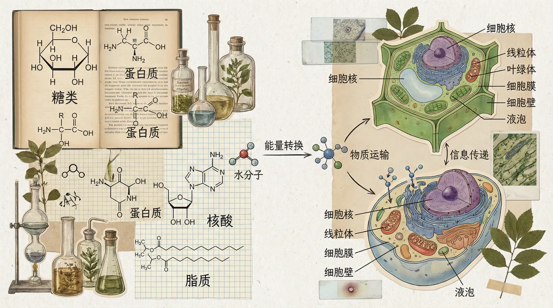 细胞之间的分工和联合,又进一步构成了组成生物体的各种组织和器官。不同类型的细胞虽然化学成分相似,却能通过基因的选择性表达转换出千变万化的形态和功能。无论是动物、植物还是微生物,其本质归根结底都是无数微小细胞中的化合物,通过有序而复杂的化学过程,编织出生命的浩瀚乐章。