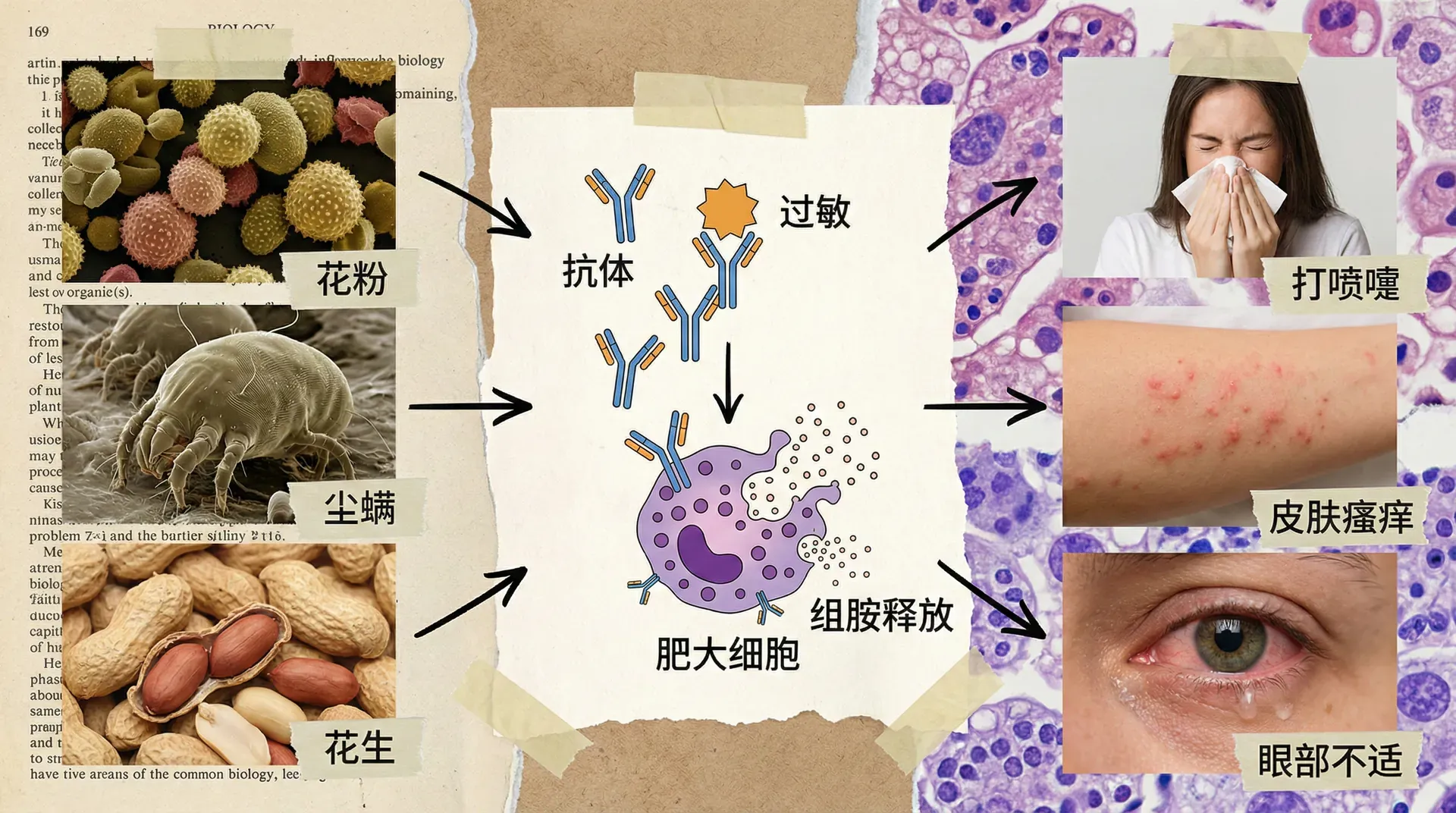 免疫系统是身体的防御部队,但有时它会对无害的物质发动攻击。当身体对某种外来蛋白质“敏感”后,再次接触时就会产生过度反应:鼻黏膜肿胀、鼻涕增多、咳嗽、打喷嚏、眼睛流泪、支气管收缩导致呼吸困难(哮喘)。这就是过敏反应。