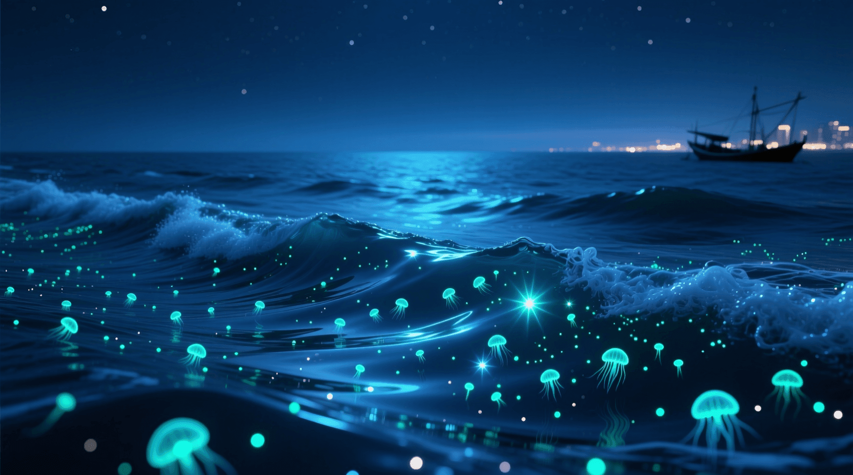 让我们看一个中国海域的有趣现象。在东海和南海的夜晚,海浪常常闪闪发光,这种现象被称为“海火”。造成这种奇观的是一种叫做甲藻的单细胞海洋生物。甲藻能够将储存在有机分子中的能量转化为光能,这个过程叫做生物发光。大多数发光生物生活在海洋中,不过陆地上也有,比如夏夜里常见的萤火虫。