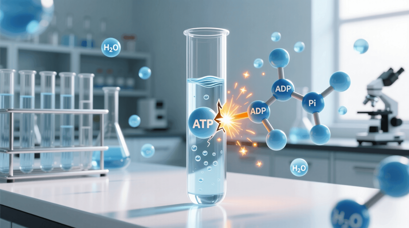 ATP磷酸基团之间的键可以通过水解断裂。当末端磷酸键被水分子加成断裂时,一个无机磷酸分子离开ATP,ATP变成二磷酸腺苷或ADP。该反应是放能的,每摩尔ATP水解释放7.3千卡能量: