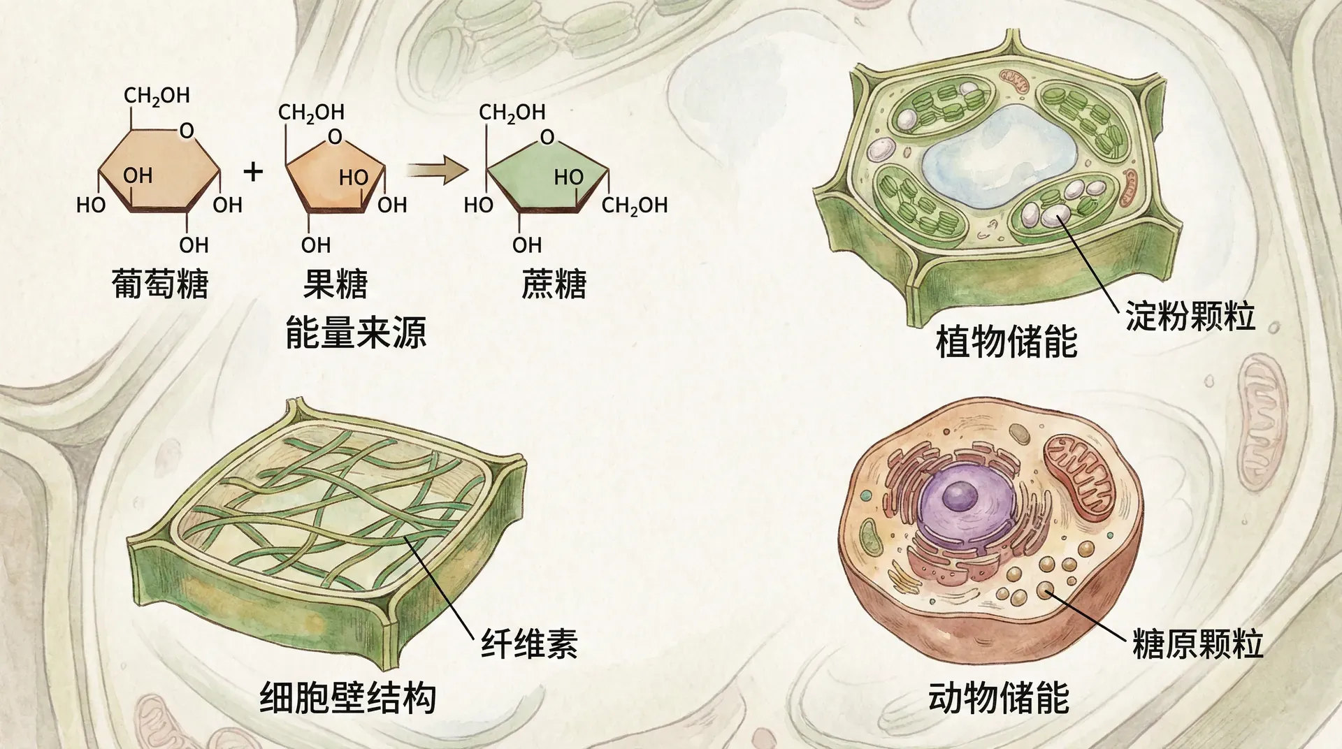 植物和动物都以储存多糖的形式储存糖分以备后用。植物储存淀粉,这是一种葡萄糖单体的聚合物,以颗粒形式存在于质体(包括叶绿体)等细胞结构中。