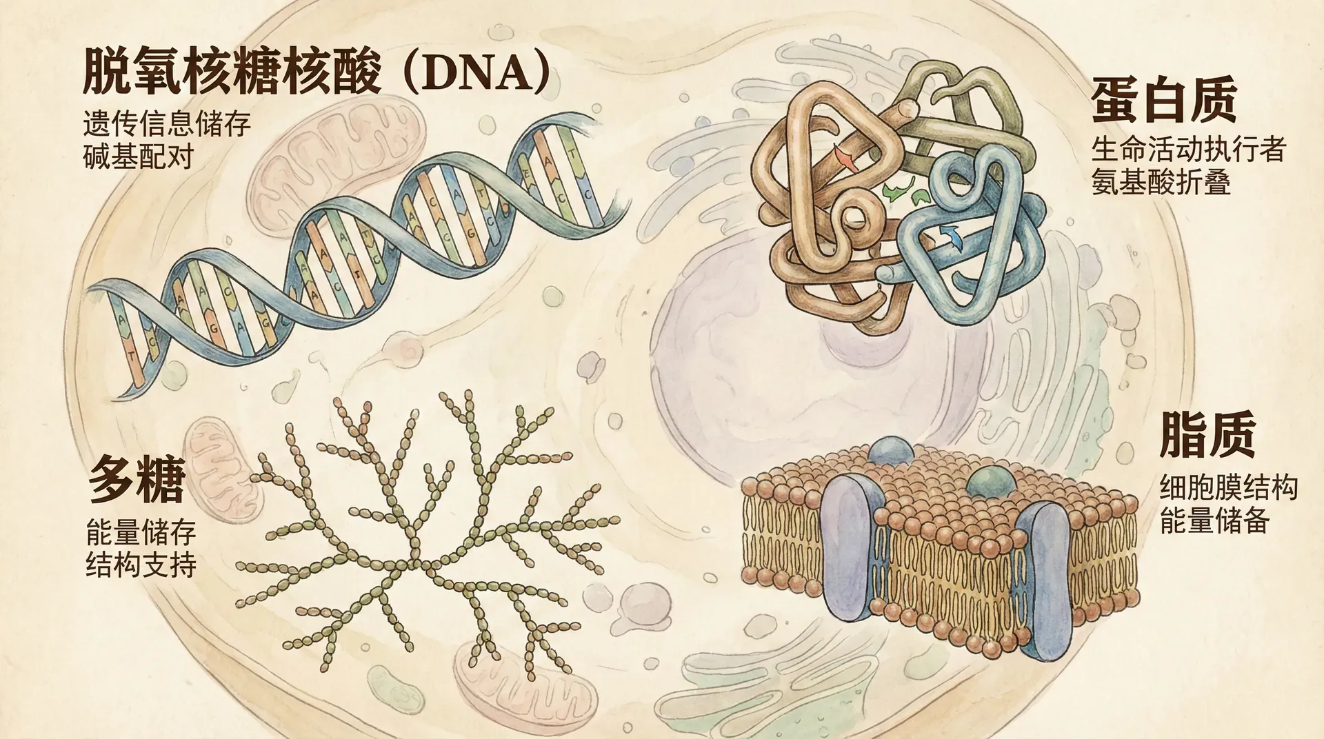 通过本部分的学习,我们系统地了解了生命大分子的基本结构与功能,包括核酸、蛋白质、多糖和脂类等主要类型。这些分子不仅在分子水平上展现出高度的复杂性和规律性,还彼此相互作用,协同完成细胞所需的各种生理功能。从简单的单体到复杂的聚合物,每一步的结构设计都凝聚了进化的智慧,体现了生命体系的精妙和高效。