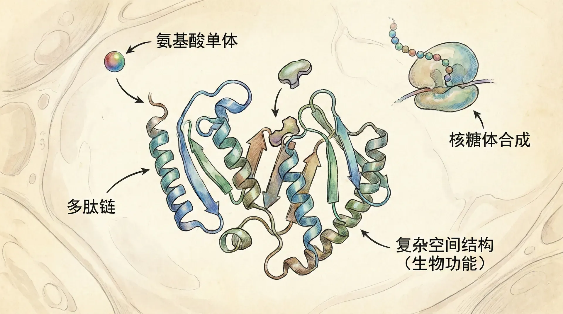 所有蛋白质都由同一套20种氨基酸构成,以无分支聚合物的形式连接。氨基酸之间的键称为肽键,因此氨基酸聚合物称为多肽。蛋白质是一个生物功能分子,由一个或多个多肽组成,每个多肽都折叠并盘绕成特定的三维结构。