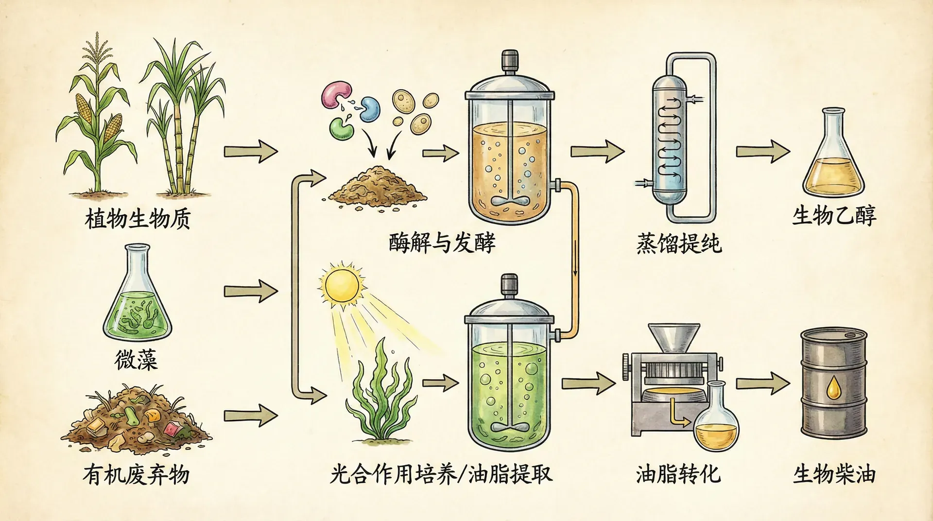 藻类生物柴油生产工艺链主要包括藻种选育、光生物反应器培养、高密度收获、油脂提取及酯化转化等环节。通过优化CO₂供应、光照条件和营养盐调控,可大幅提升藻类产油效率。近年来,新型酶解法或超声提取法也逐步应用于藻油的绿色高效提取。