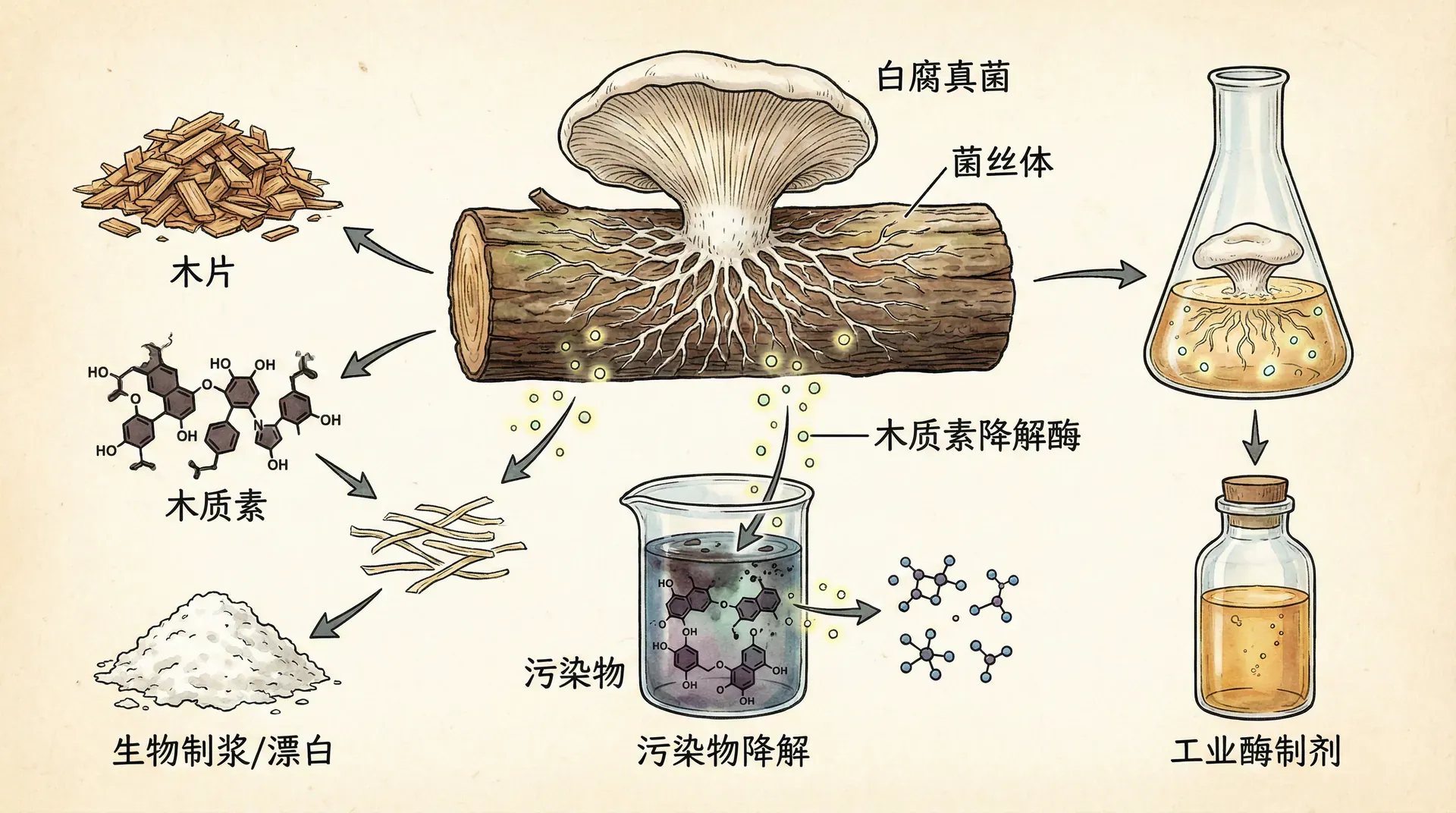 更令人惊喜的是,许多人工合成的有机污染物在分子结构上与木质素有相似之处。这意味着白腐真菌降解木质素的这套“武器装备”同样可以用来对付这些污染物。这就好比一个专门拆除老式建筑的拆迁队,同样可以拆除结构类似的违章建筑。