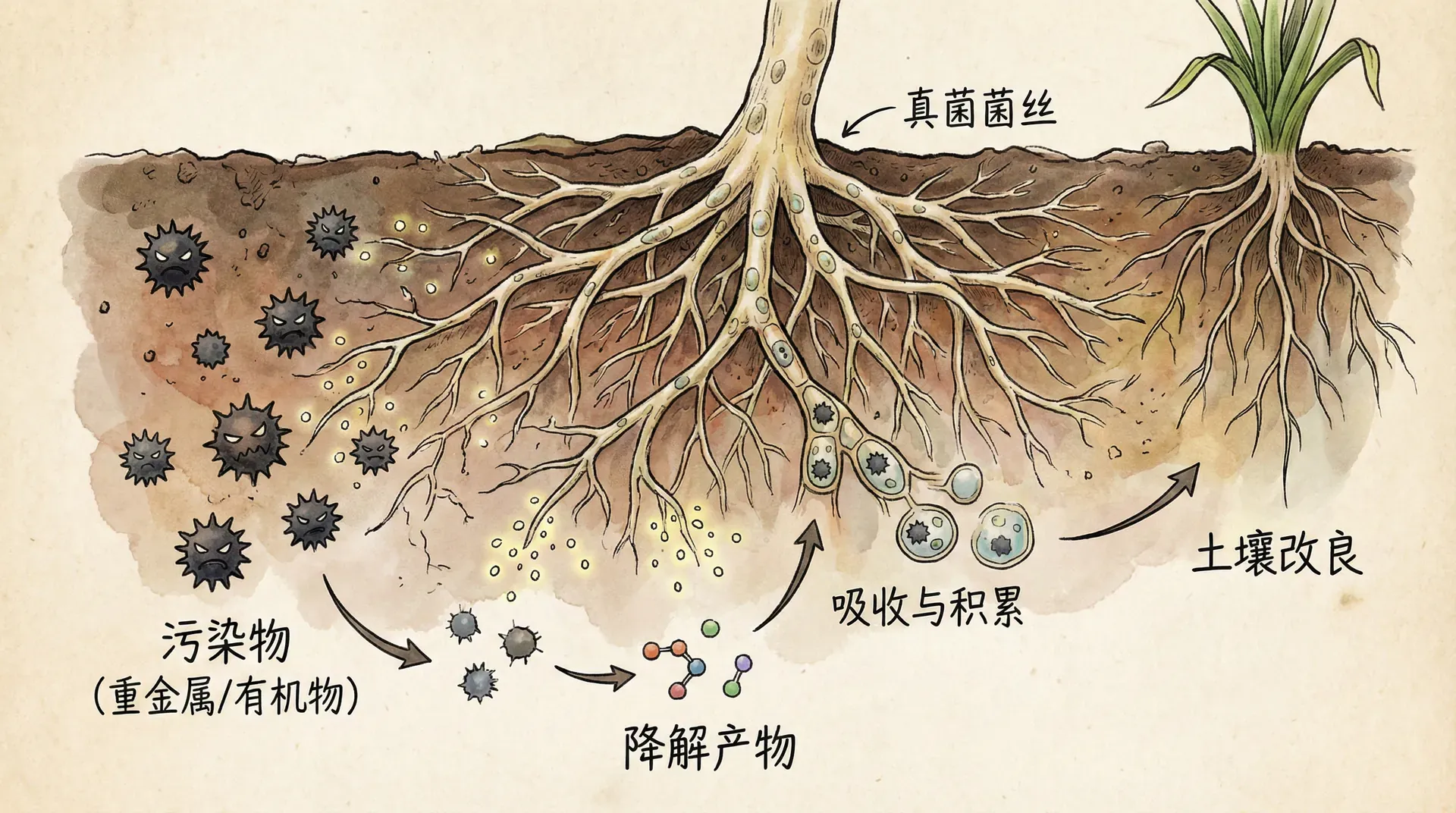 真菌治理污染主要通过四种不同的机制实现,我们可以用一个形象的比喻来理解:
