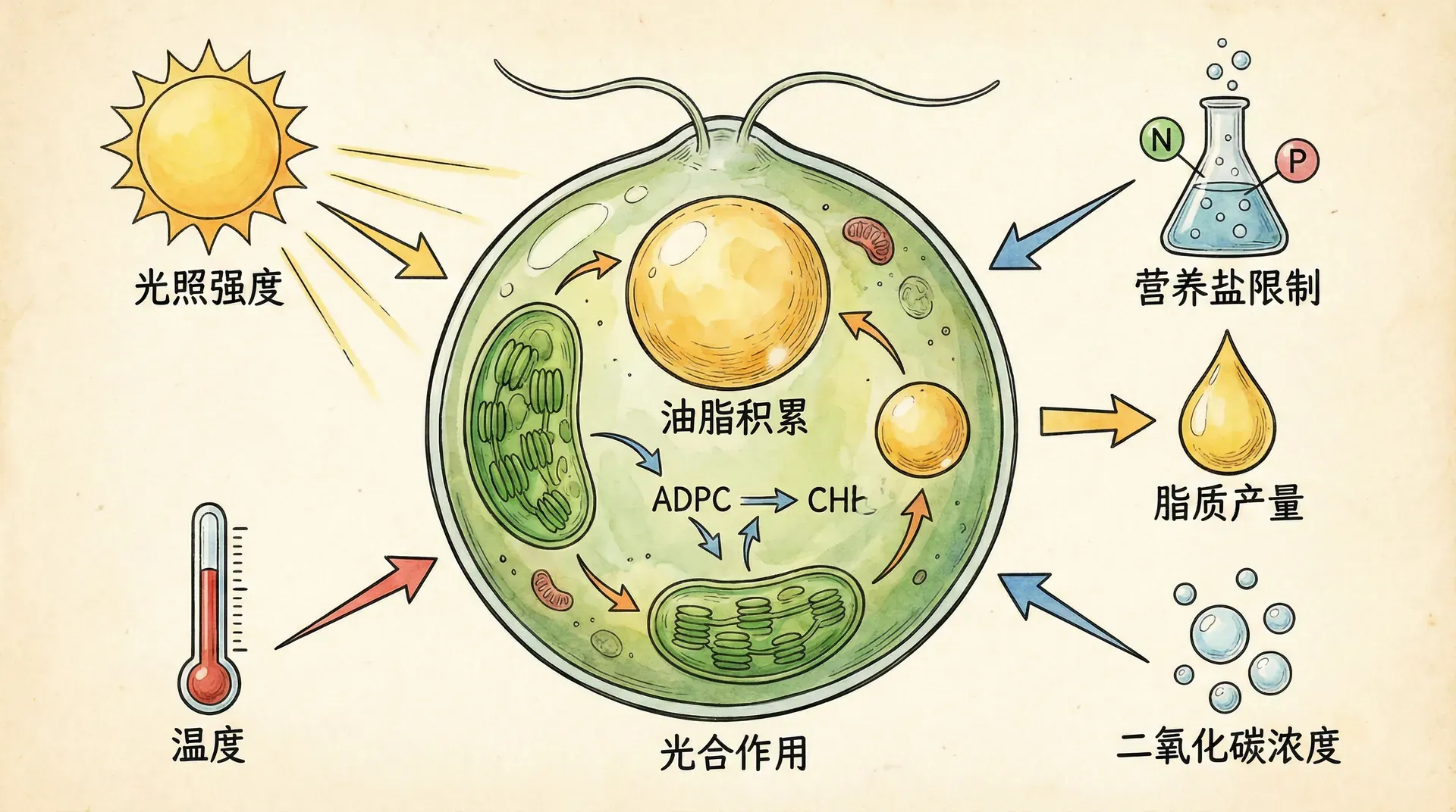 磷素限制同样能够影响微藻的脂质代谢。中科院水生生物研究所的研究表明,磷酸盐缺乏会引起细胞膜磷脂的分解,释放出的脂肪酸重新组装成三酰甘油。但相比氮素限制,磷素限制的效果通常较为温和。