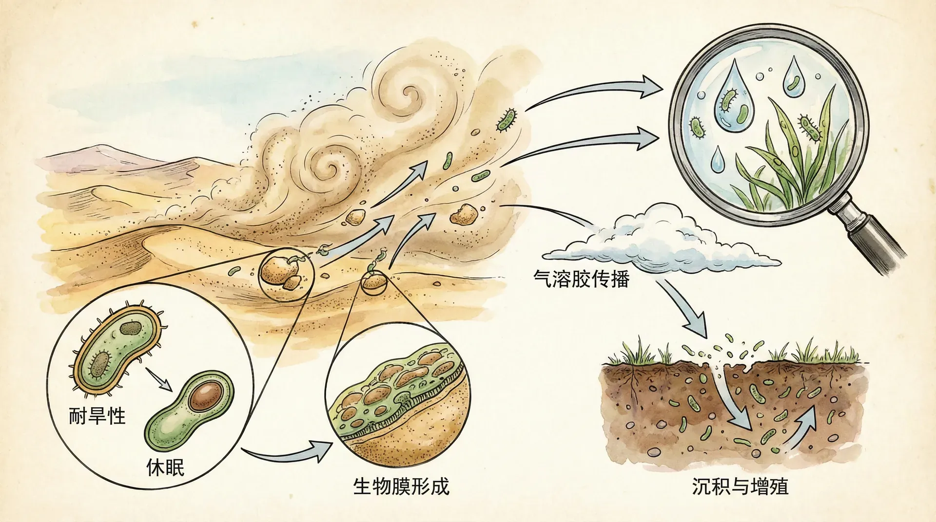 微生物能够在恶劣的风沙传播环境中生存,主要依赖于它们独特的适应机制。在高空传播过程中,这些微生物面临着极端的环境条件:强紫外线辐射、低温、干燥和低氧。