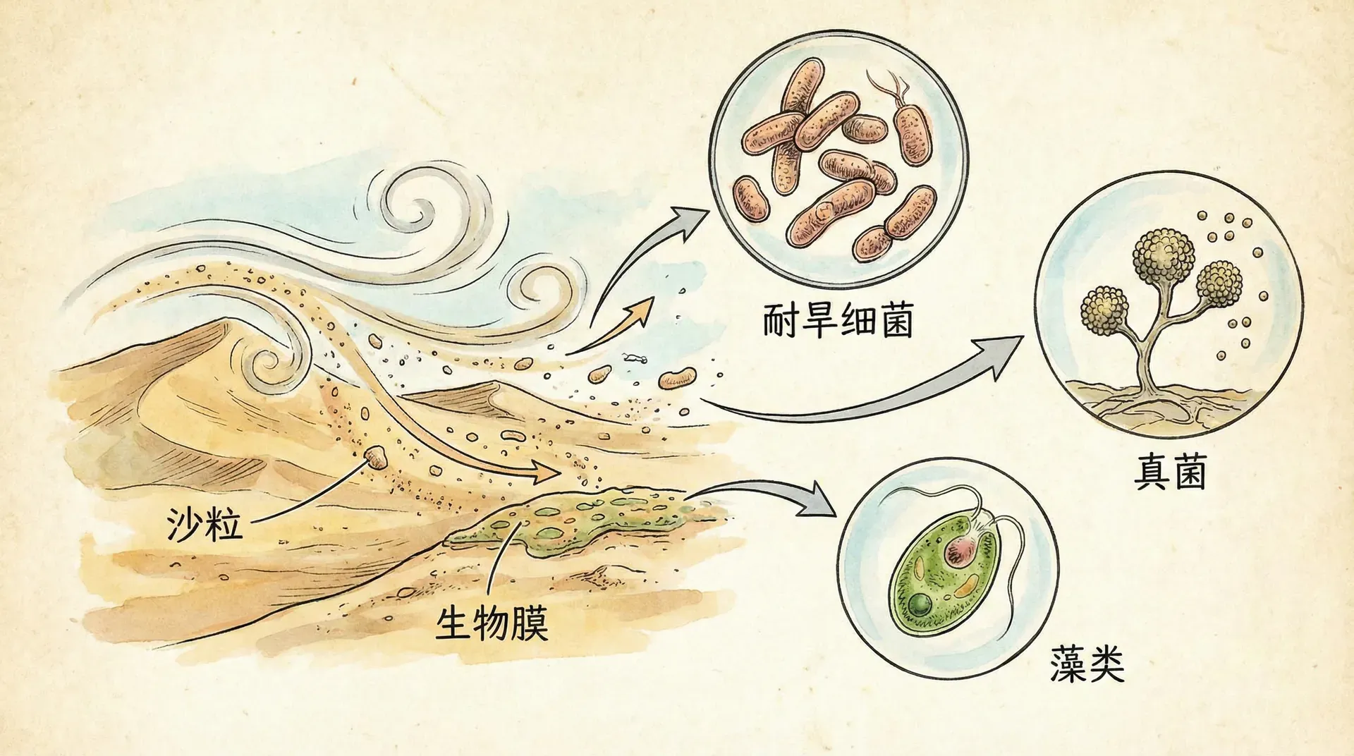 风沙并不是单纯的无机颗粒,它是一个复杂的生态系统载体。在这些看似毫无生机的沙尘颗粒表面,实际上生存着大量的微生物。通过现代分子生物学技术,科学家们在我国的沙尘样本中发现了丰富的微生物群落。