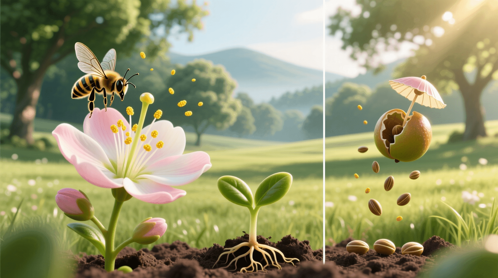 花粉从雄蕊传递到雌蕊的过程叫授粉。有些植物自己完成授粉(自花授粉),如水稻、小麦等,同一朵花即可完成受精;还有一些依靠风、昆虫甚至人为帮助来实现“异花授粉”,如苹果、玉米等。自花授粉可以保持品种稳定,异花授粉则有利于遗传多样性和杂交优势的发挥。