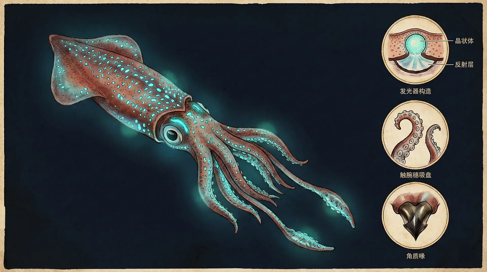 夜晚,乌贼游动觅食,发光器持续工作。通过调节发光器开口和内部反射结构,乌贼能够控制光线的强度和方向,使其与月光和星光相匹配,消除自己的影子。这个精确的伪装使乌贼能够安全地在开阔水域活动。