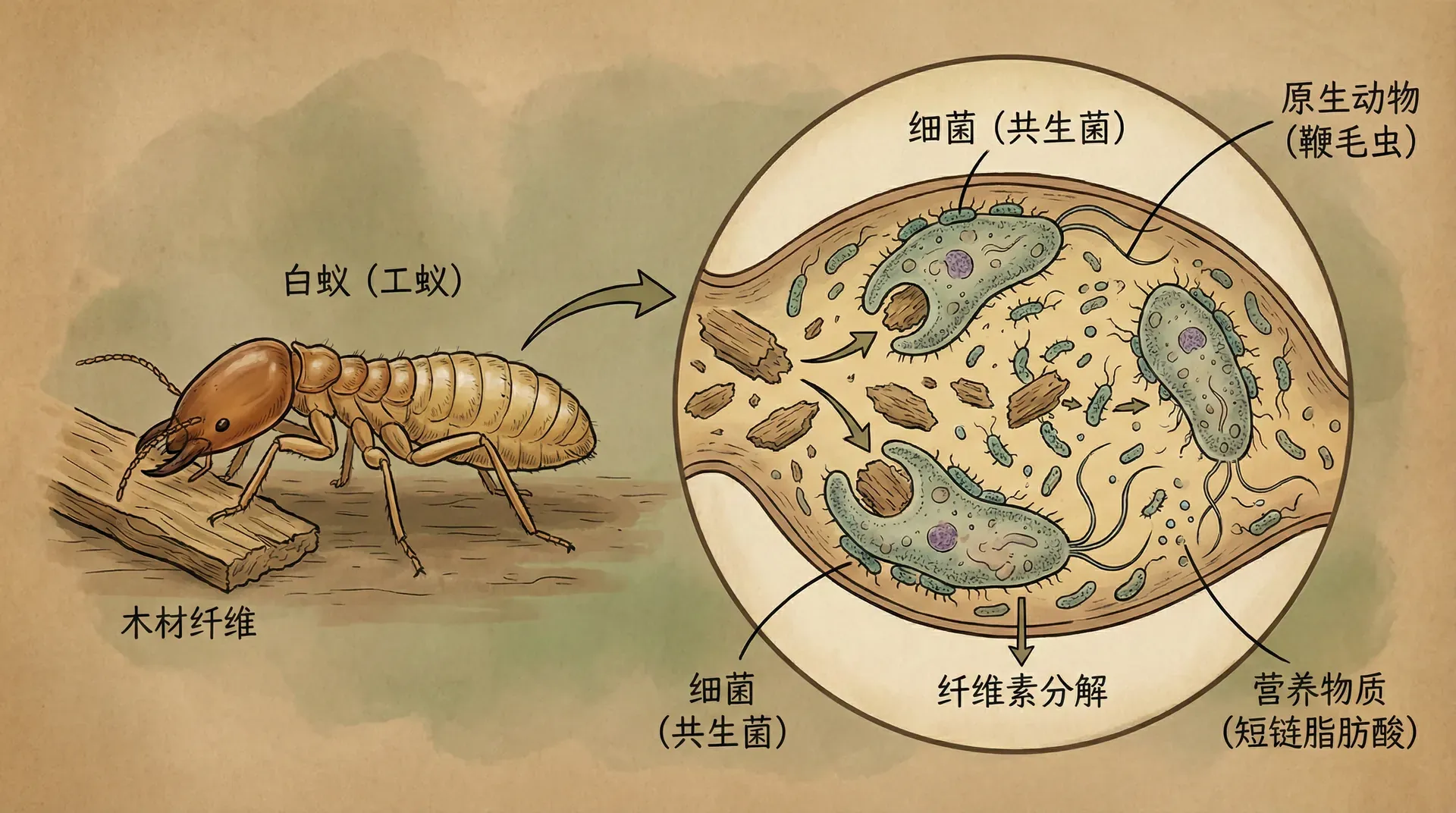 南方省区的土壤和枯木中,成群的黑翅土白蚁(Odontotermes formosanus)靠啃食木头为生。但木头的主要成分是结构坚固的纤维素,绝大多数动物无法自行降解。白蚁的“秘密武器”来自肠道中的共生原生动物、细菌和真菌。