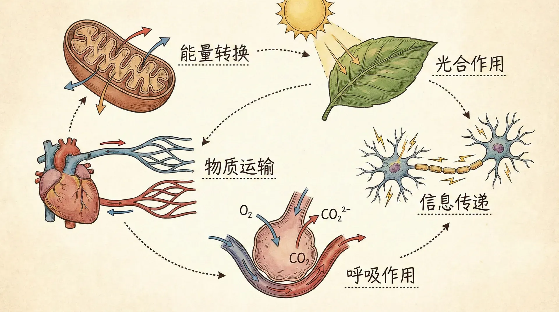 生命过程不是彼此孤立地进行的,而是相互依赖、密切联系。以呼吸作用为例,它持续不断地为生物体提供氧气,使细胞能够获得合成蛋白质、分裂产生新细胞以及进行肌肉运动等生命活动所需的能量。而细胞新合成的有机物质,又会被用于生物体的生长和修复,随着新陈代谢的发生,旧的物质被分解并通过各种途径排出体外。