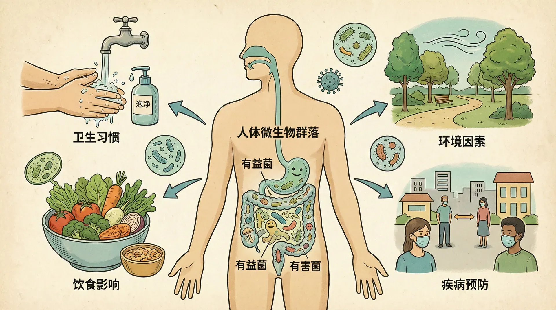 从图表可以看出,人体几乎每个与外界接触的部位都有微生物定植。这些微生物不是“入侵者”,而是人体生态系统的正常组成部分。