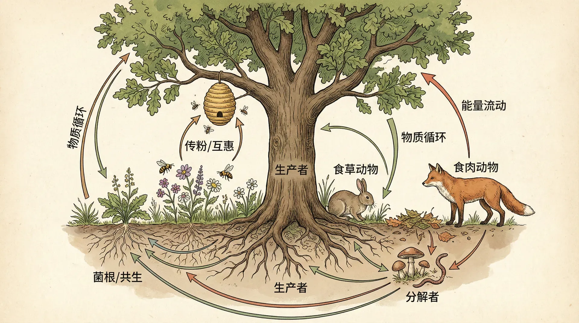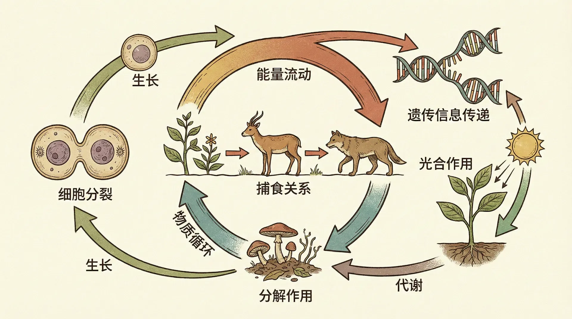 这个例子展现了生命世界的第三个重要特征:生物之间的相互依存。没有任何生物是完全独立存在的孤岛,每种生物都嵌入在与其他生物的关系网络之中。这些关系不仅仅是可有可无的“外部联系”,而是构成生物体本身的重要部分。