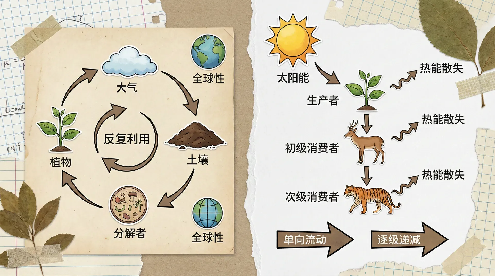 在生态系统中,能量流动与物质循环构成了生命支持系统的两大基本过程。此前我们讨论了能量流动的单向性——太阳能经过生产者、消费者逐级流向分解者,最终以热的形式散失。但物质循环则不同,生态系统中的碳、氮、水等元素可以在生物和环境之间反复循环使用,不会“消失”,而是以不同的化学形态流转于各种生命过程和无生命环境中。