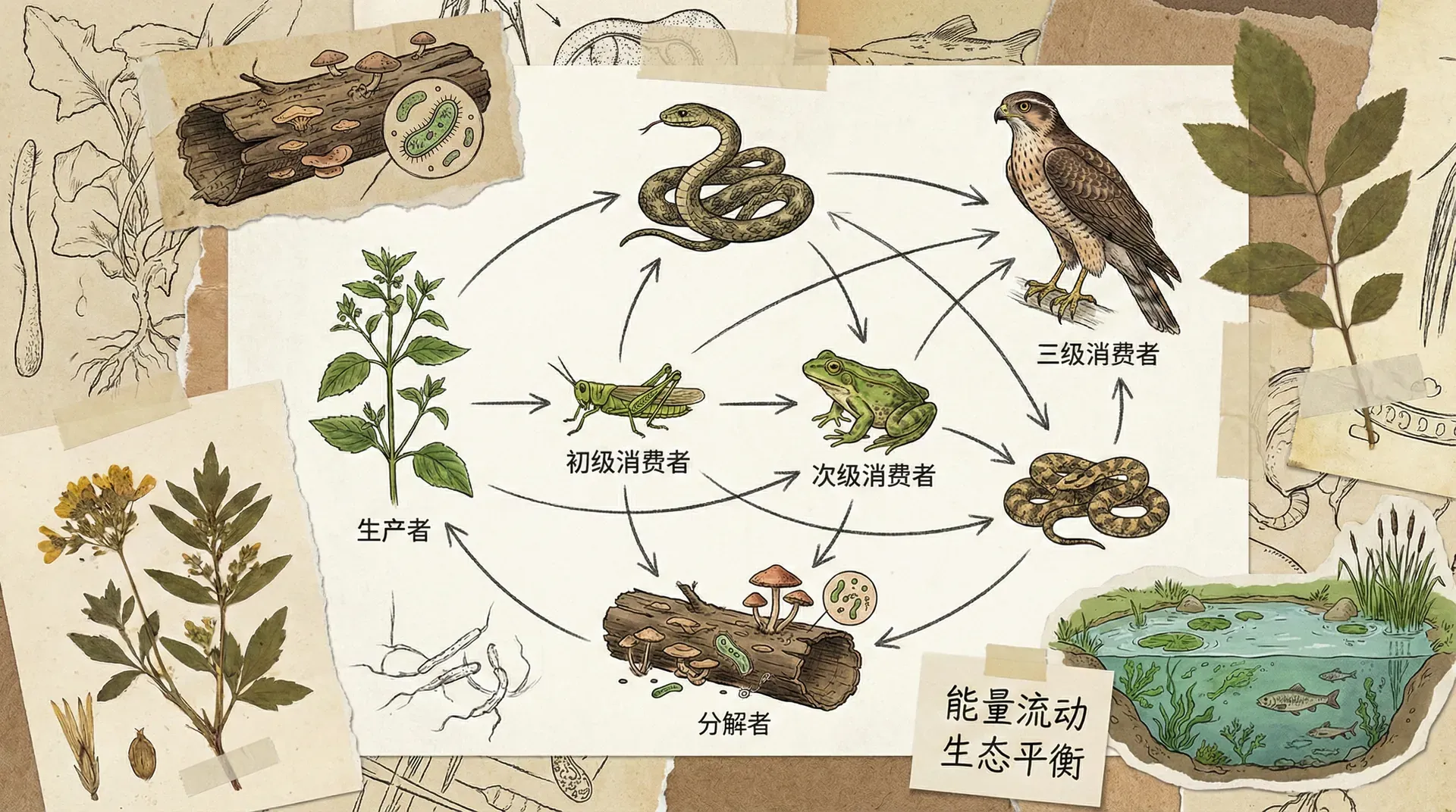 在介绍营养级时,我们描述了一条简单的能量传递路径:水草→草鱼→鳜鱼→鸬鹚。这就是一条食物链,它清晰地展示了能量如何一级一级向上传递。然而,真实的生态系统远比这复杂得多。