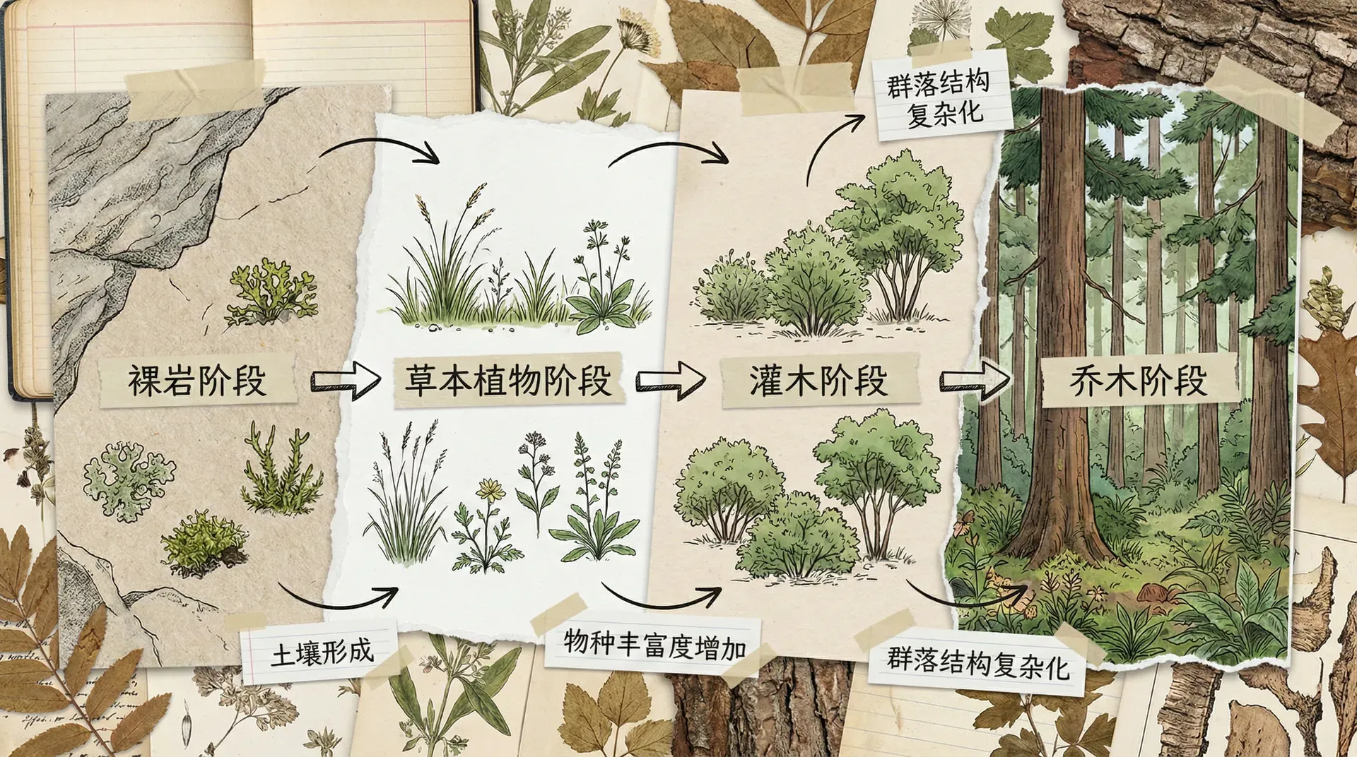 次生演替:发生在原有植被被破坏但土壤仍然保留的地方,比如森林火灾后、农田弃耕后。次生演替因为有土壤和种子库,通常进行得比原生演替快得多。
