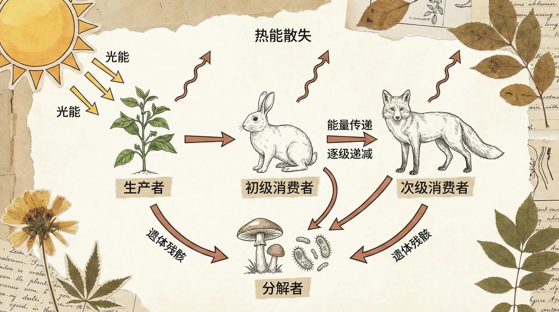 这个道理来自热力学第二定律。简单说就是,能量倾向于从有序状态向无序状态转变。当一只野兔吃草时,草中储存的化学能一部分转化为兔子的身体组织,但大部分在兔子的生命活动中以热能形式散失了——维持体温、运动、新陈代谢都需要消耗能量。同样,当狼吃掉野兔时,又只能获得野兔体内一小部分的能量。